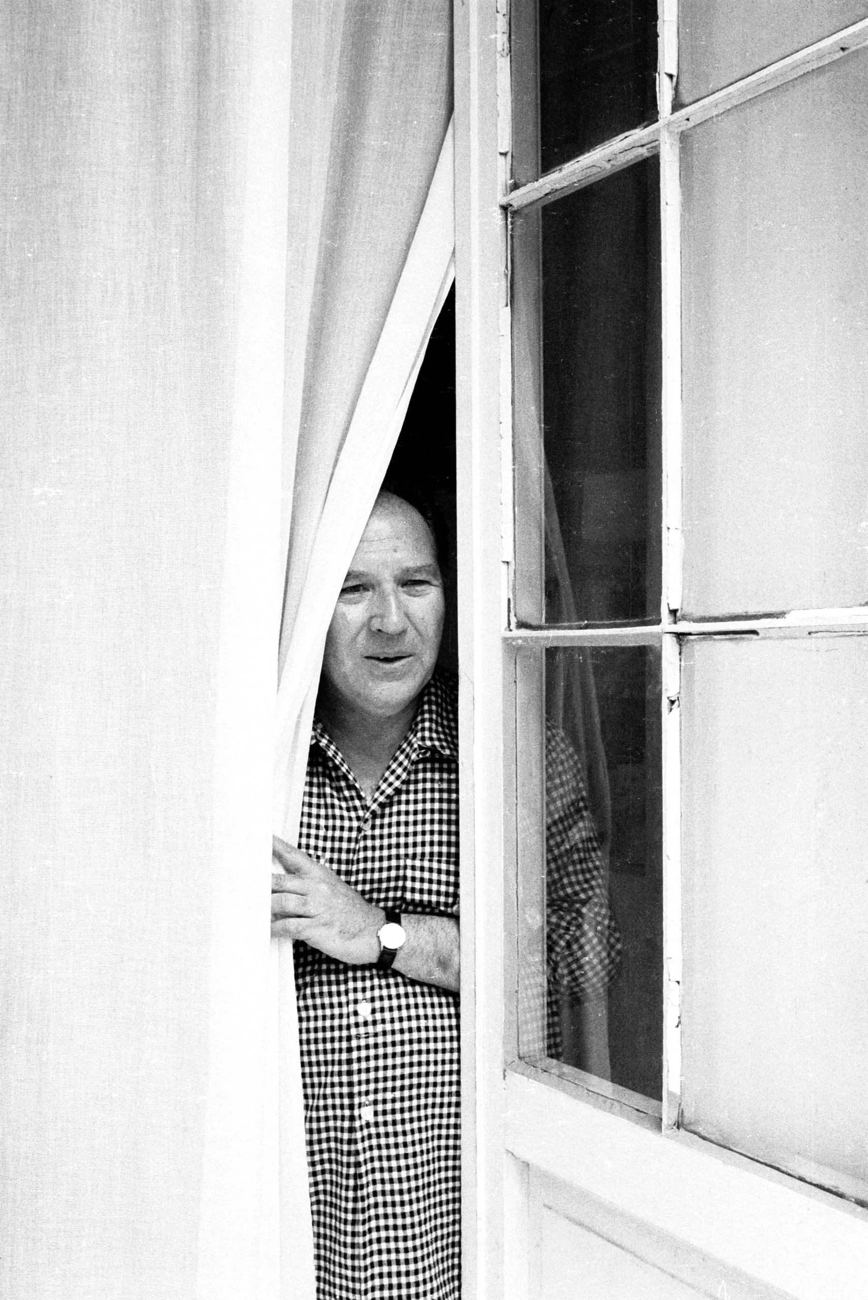Black and white photograph of a bald man in a gingham shirt peering around the edge of a light curtain beside a multi-paned window