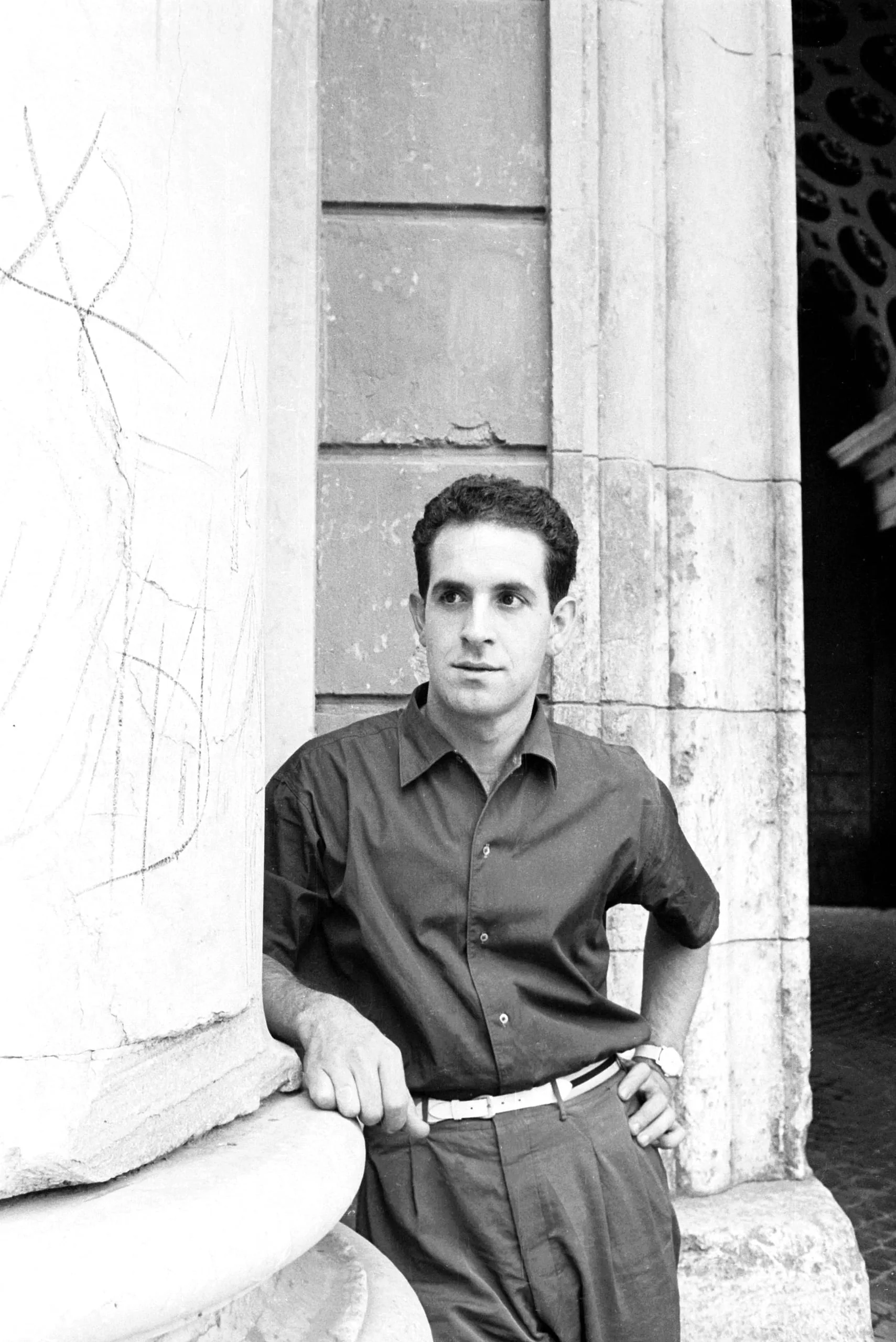 Black and white photograph, young man leaning against a weathered stone column outside a classical building, wearing a dark short-sleeved shirt and pleated trousers