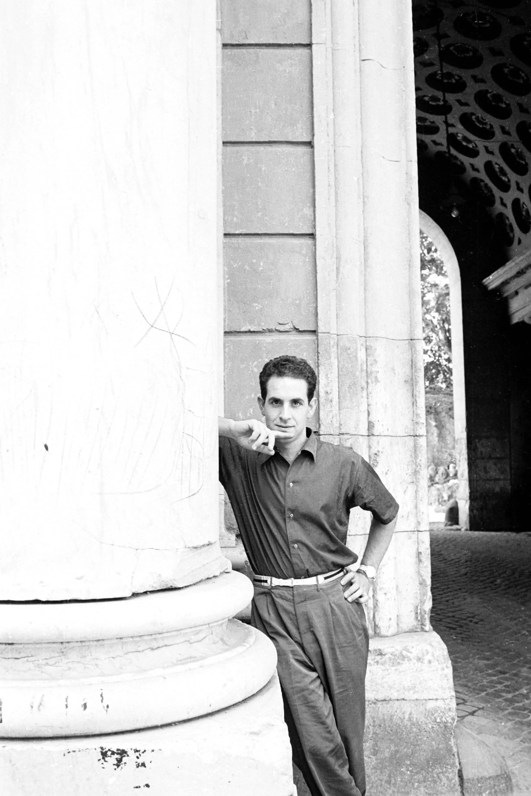 Black and white photograph of a man in a short-sleeved shirt and pleated trousers leaning against a large weathered classical column outdoors