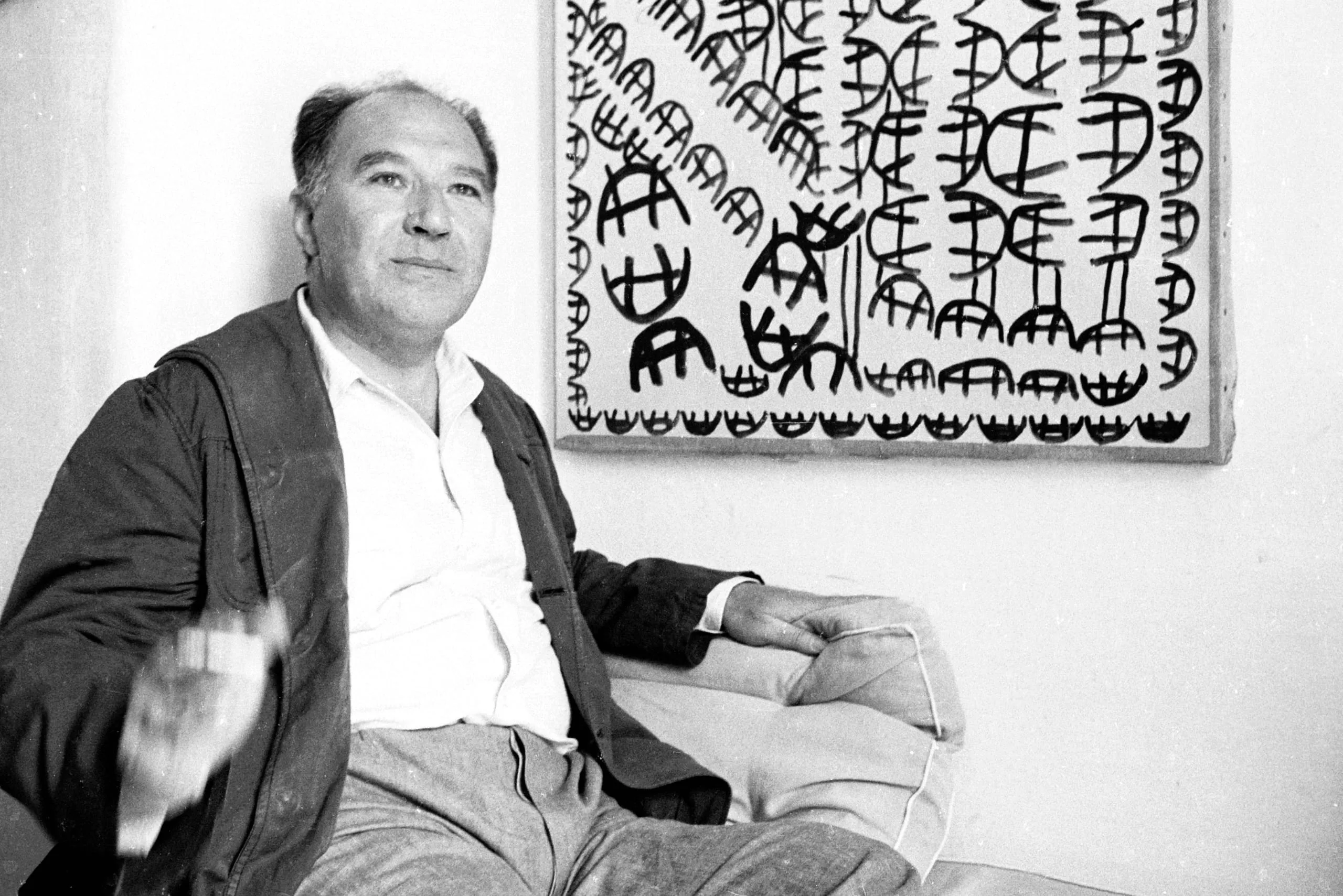 Black and white photograph of a seated middle-aged man gesturing with one hand, a large painting covered in bold abstract marks visible on the wall behind him