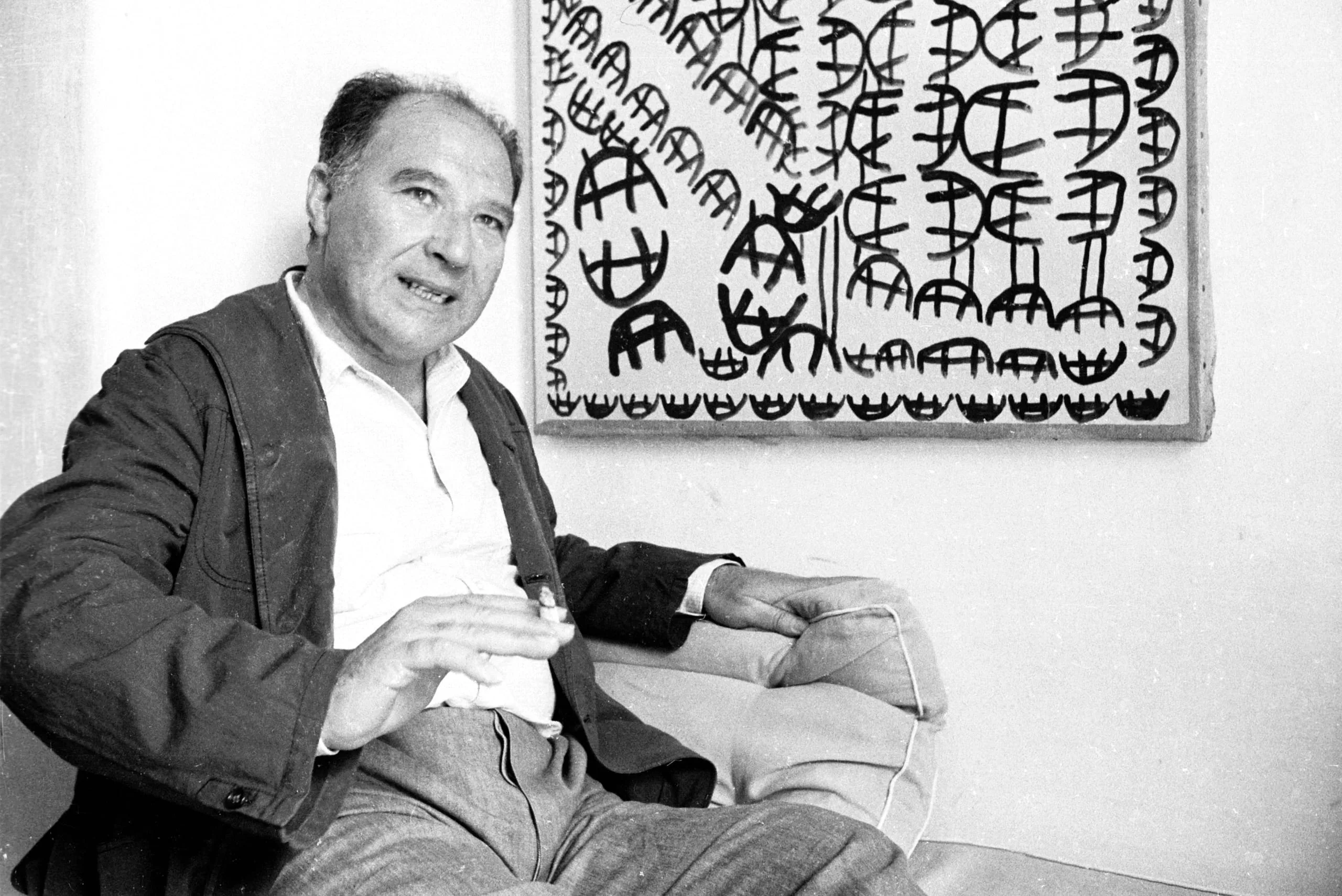 Black and white photograph of a middle-aged white man seated in a low chair, gesturing while speaking, with a large abstract painting of dense black linear symbols visible on the wall behind him