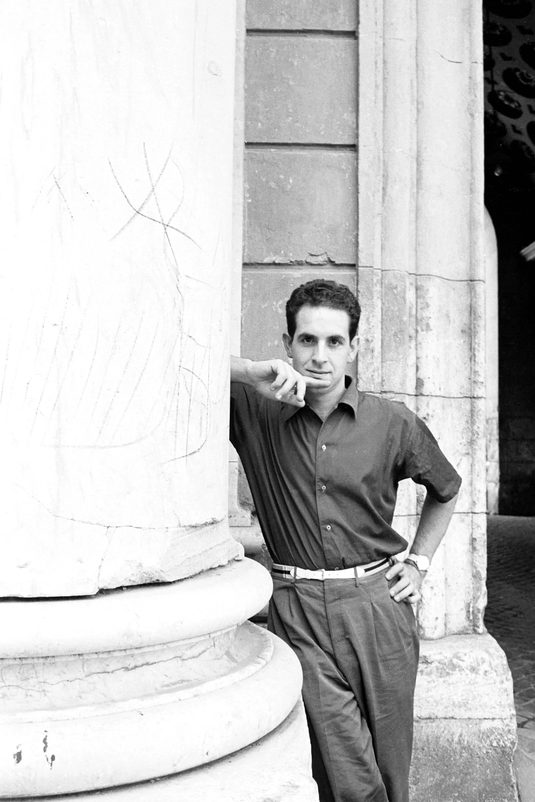 Black and white full-length portrait photograph, a dark-haired man in a short-sleeved shirt and pleated trousers leans against a large stone column, looking at the camera