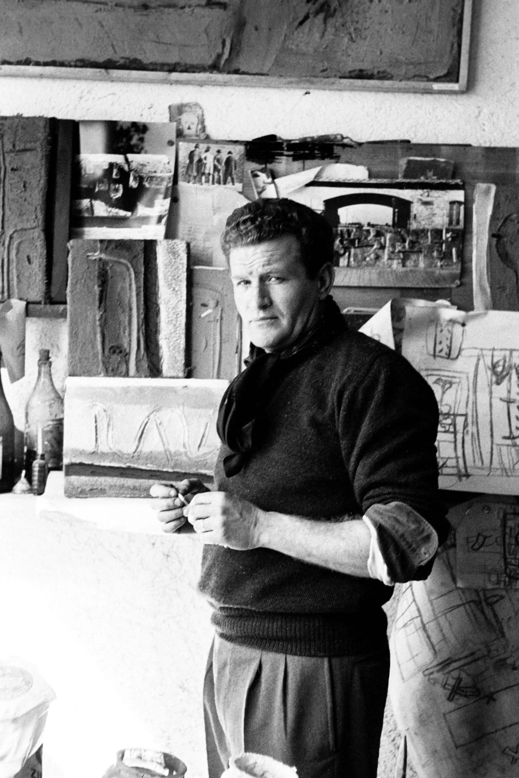 Black and white photograph of a man from the hips up, standing in an art studio surrounded by pinned sketches and photographs, holding a small object in his hands