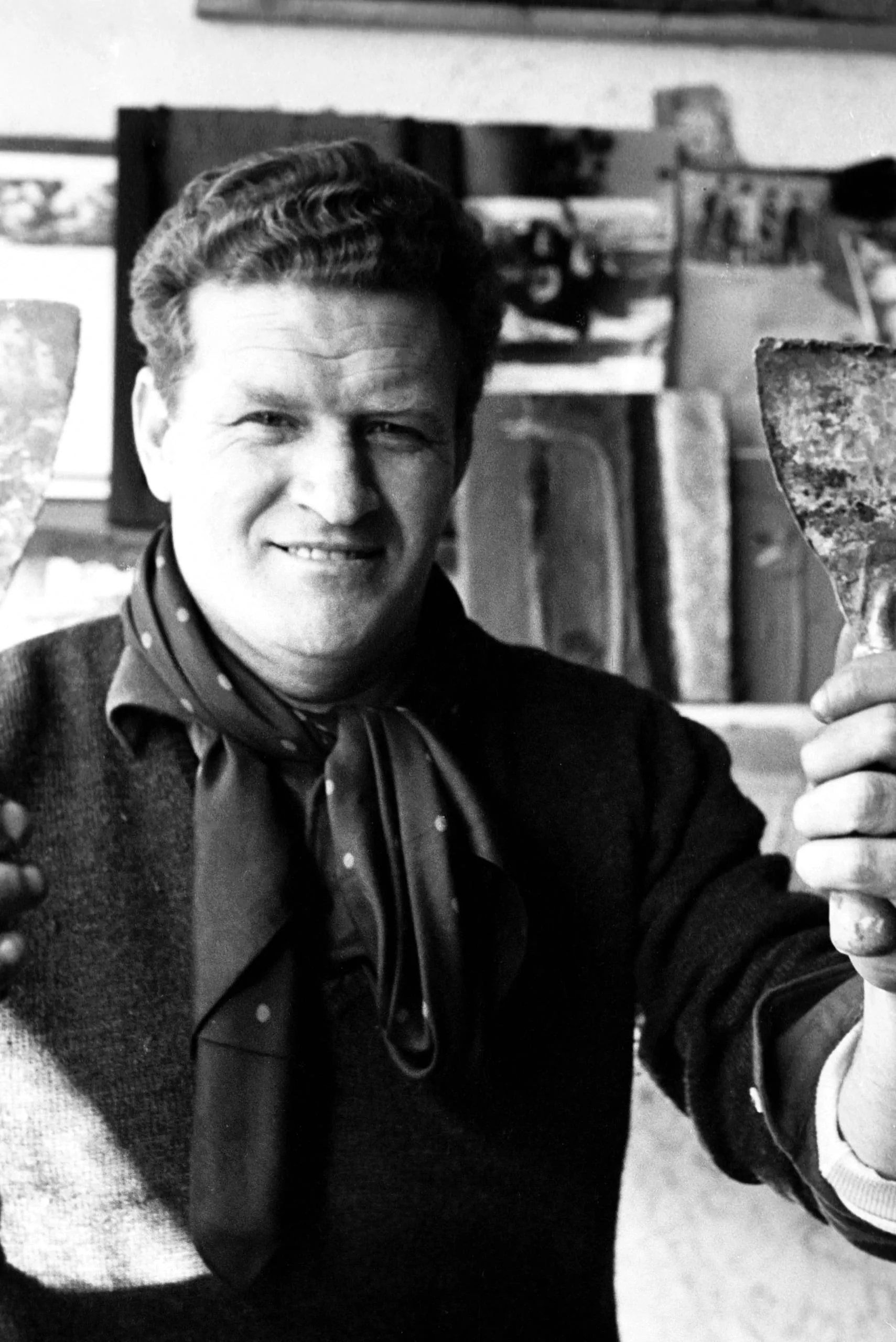Black and white photograph, chest-up portrait of a smiling man in a polka-dot scarf holding two rough stone or ceramic fragments toward the camera, studio setting behind him