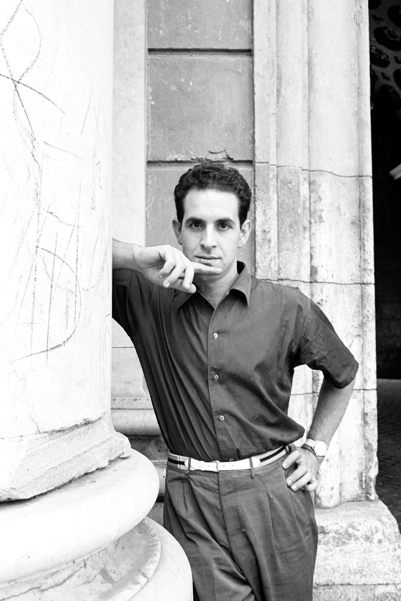 Black and white portrait photograph, a man in a short-sleeved button-down shirt leaning against a carved stone column outside a stone building