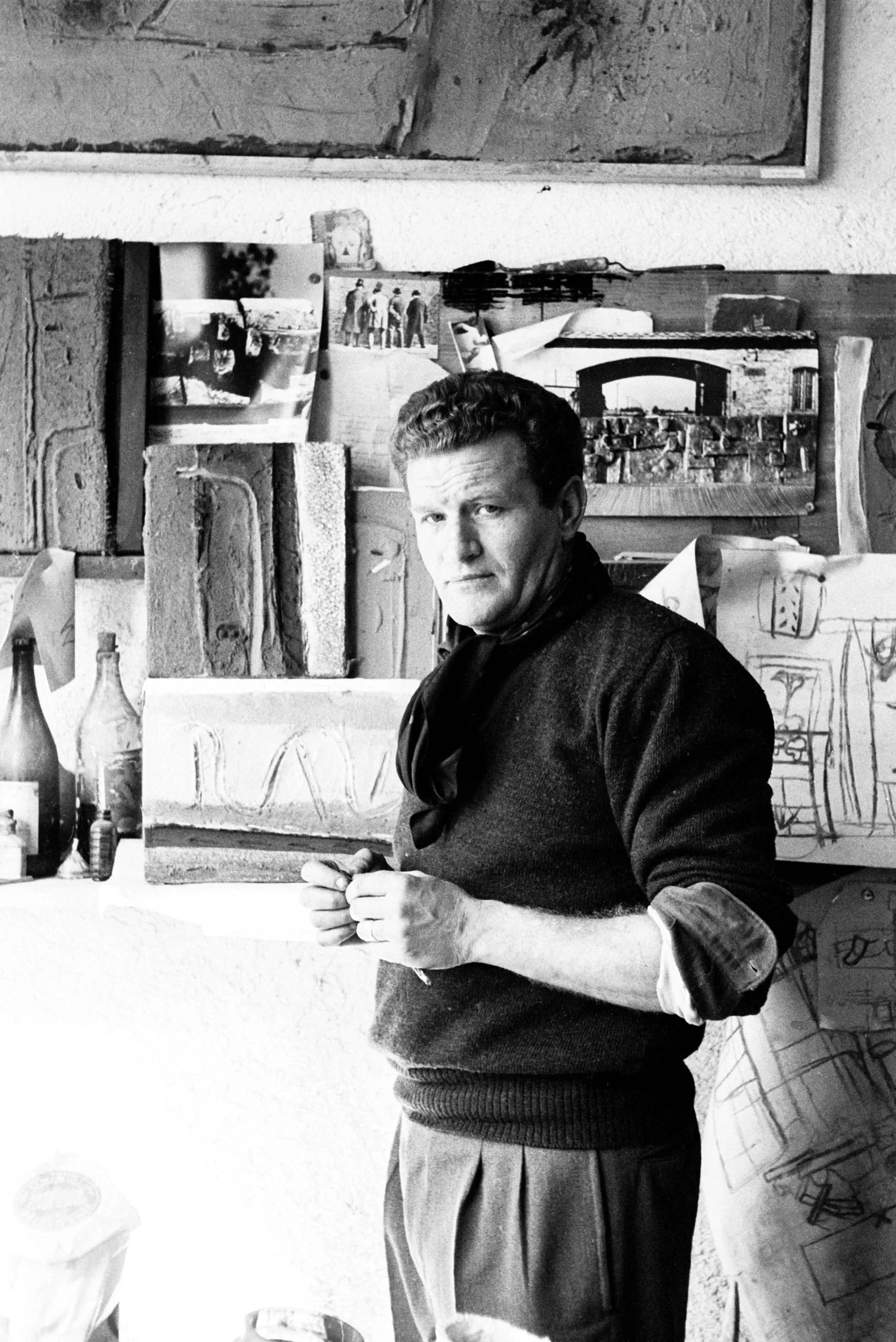 Black and white photograph, a man in a dark sweater stands three-quarter profile in an artist's studio surrounded by relief panels, sketches, and pinned photographs