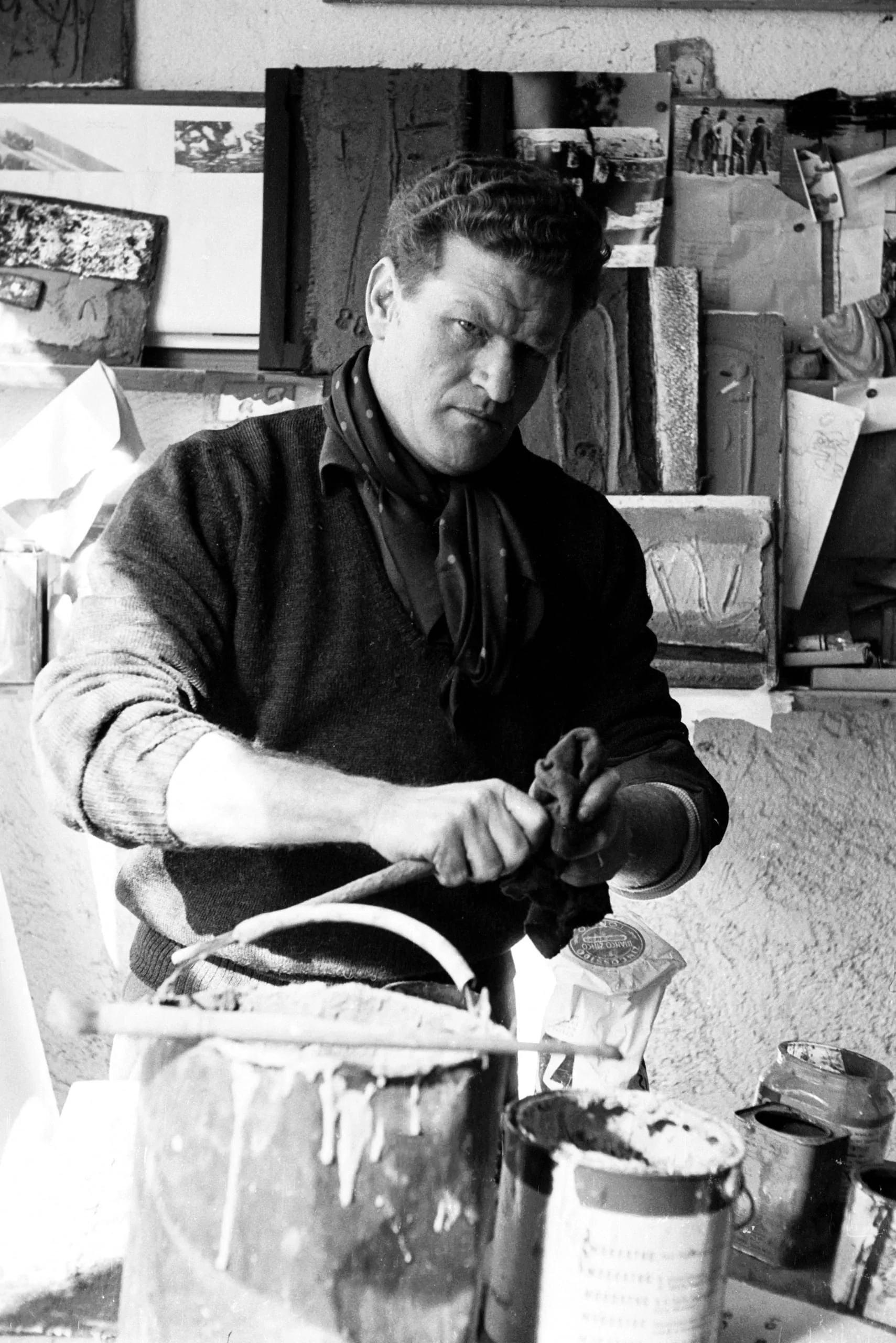 Black and white photograph of a man in a knit sweater working with a curved object at a cluttered studio table, surrounded by cans and relief panels