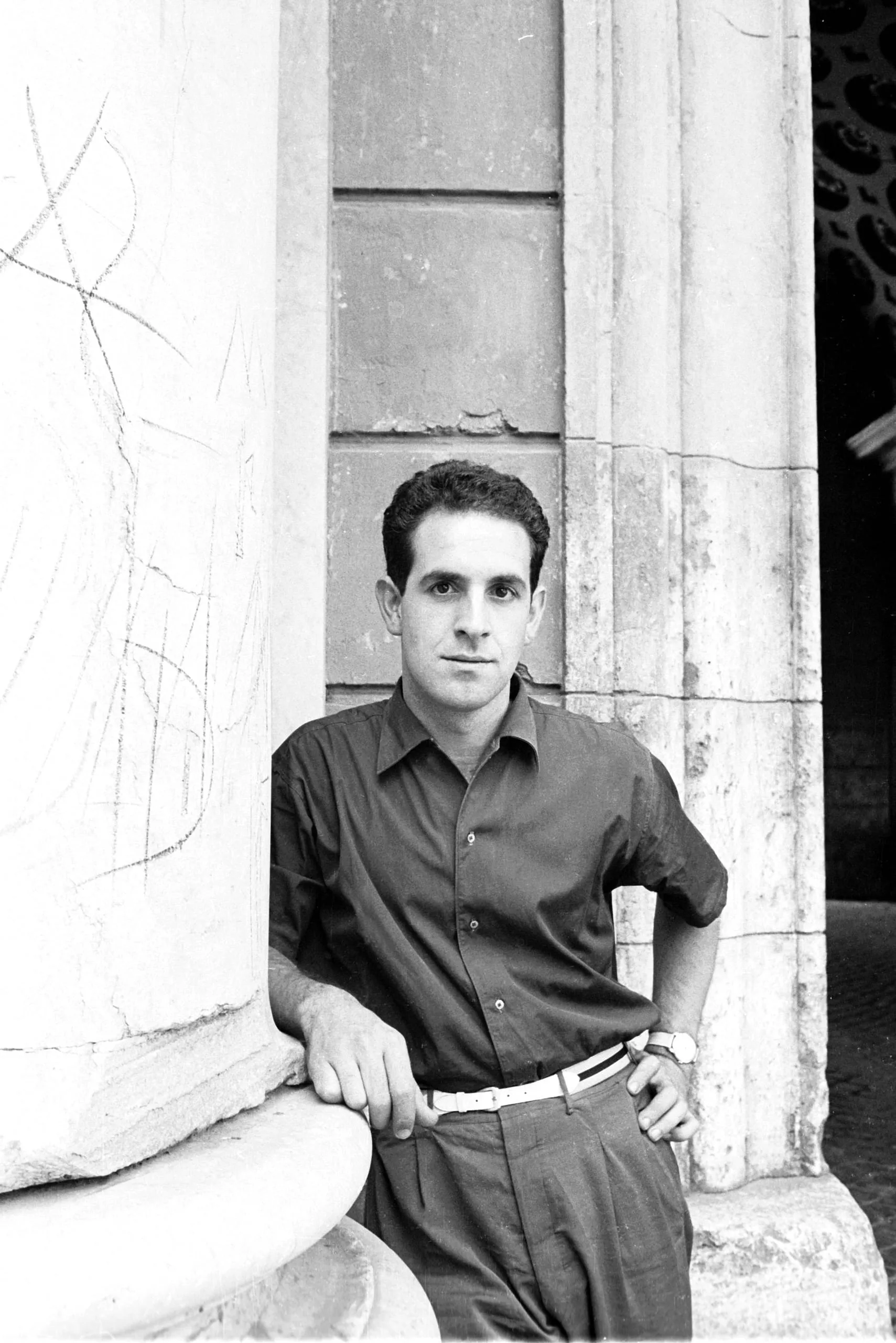 Black and white photograph of a young man in a dark short-sleeved shirt leaning against a stone column in an outdoor architectural setting
