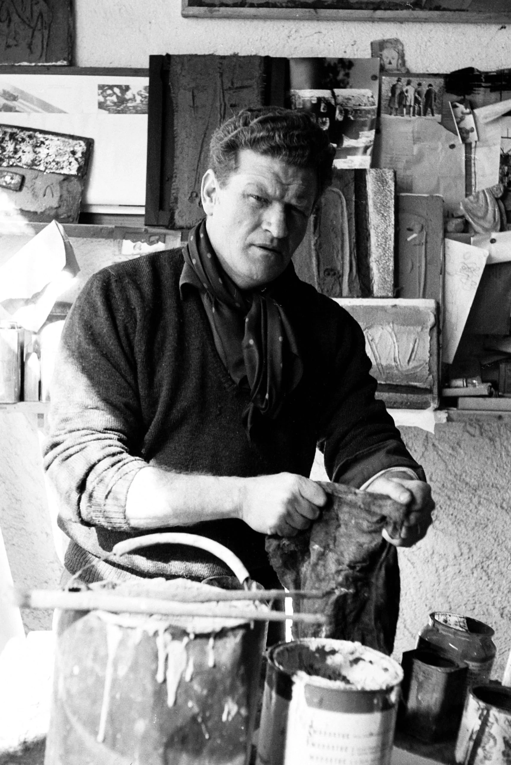 Black and white photograph of a man in a knit sweater working in an artist's studio, holding a tool, surrounded by paint cans and relief panels