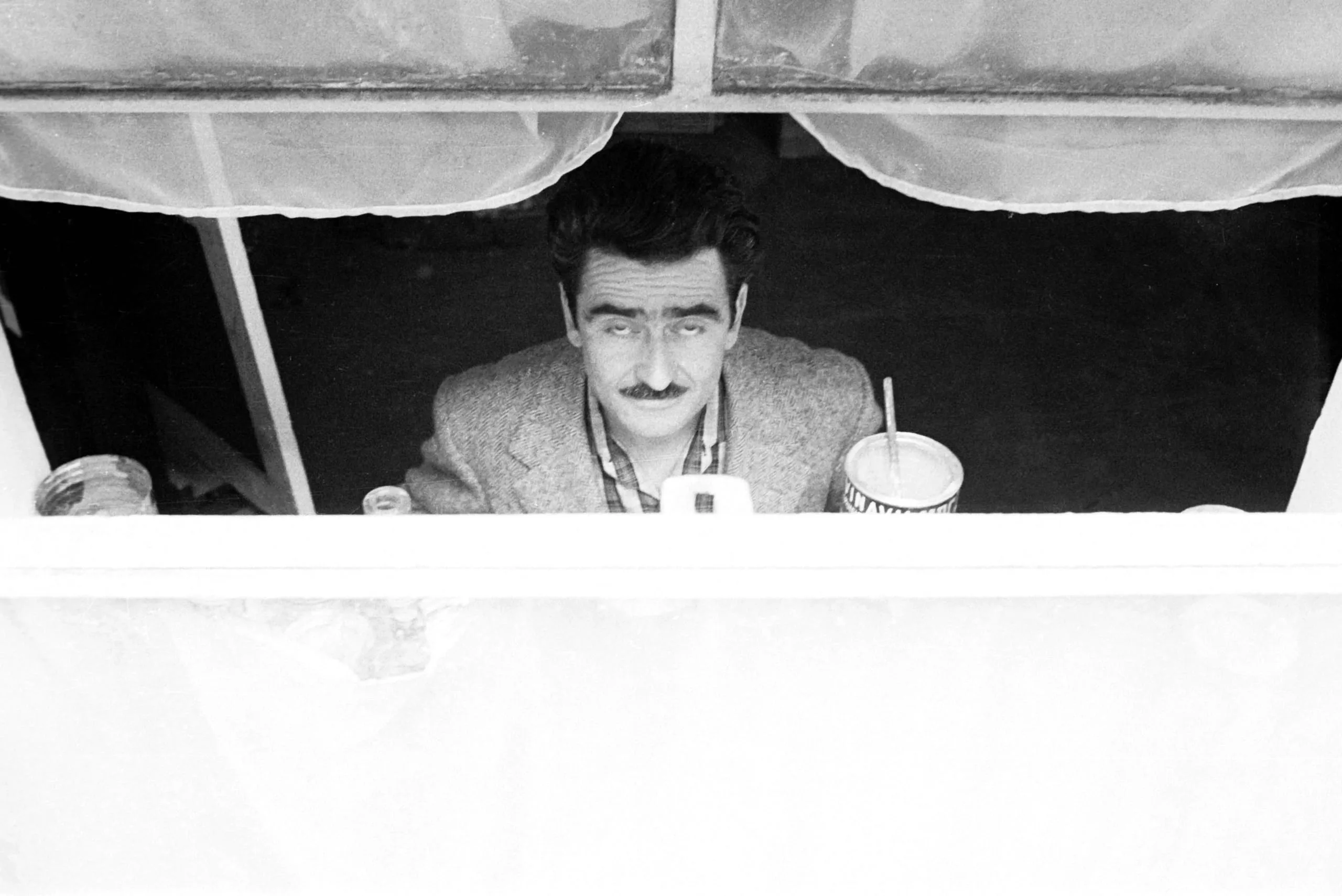 Black and white photograph of a mustachioed man in a tweed jacket peering through a concession window, with a large paper cup on the ledge in front of him