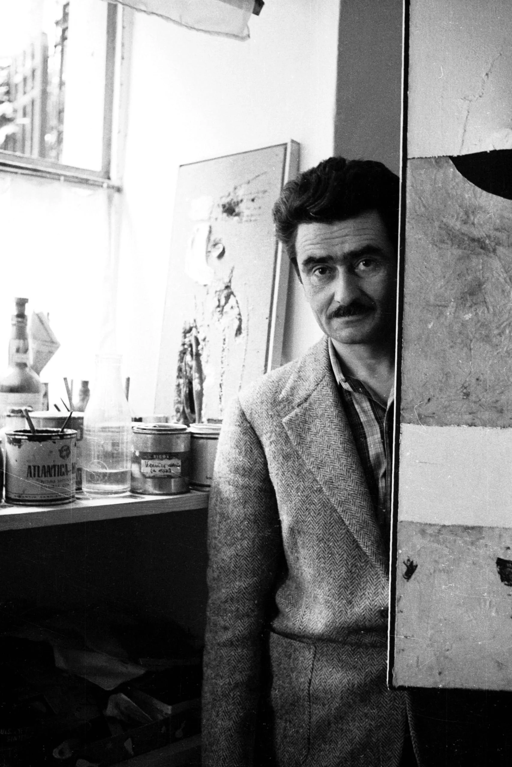 Black and white photograph of a white man in a herringbone blazer leaning against a large textured canvas in an artist's studio, paint cans and brushes visible on a shelf behind him