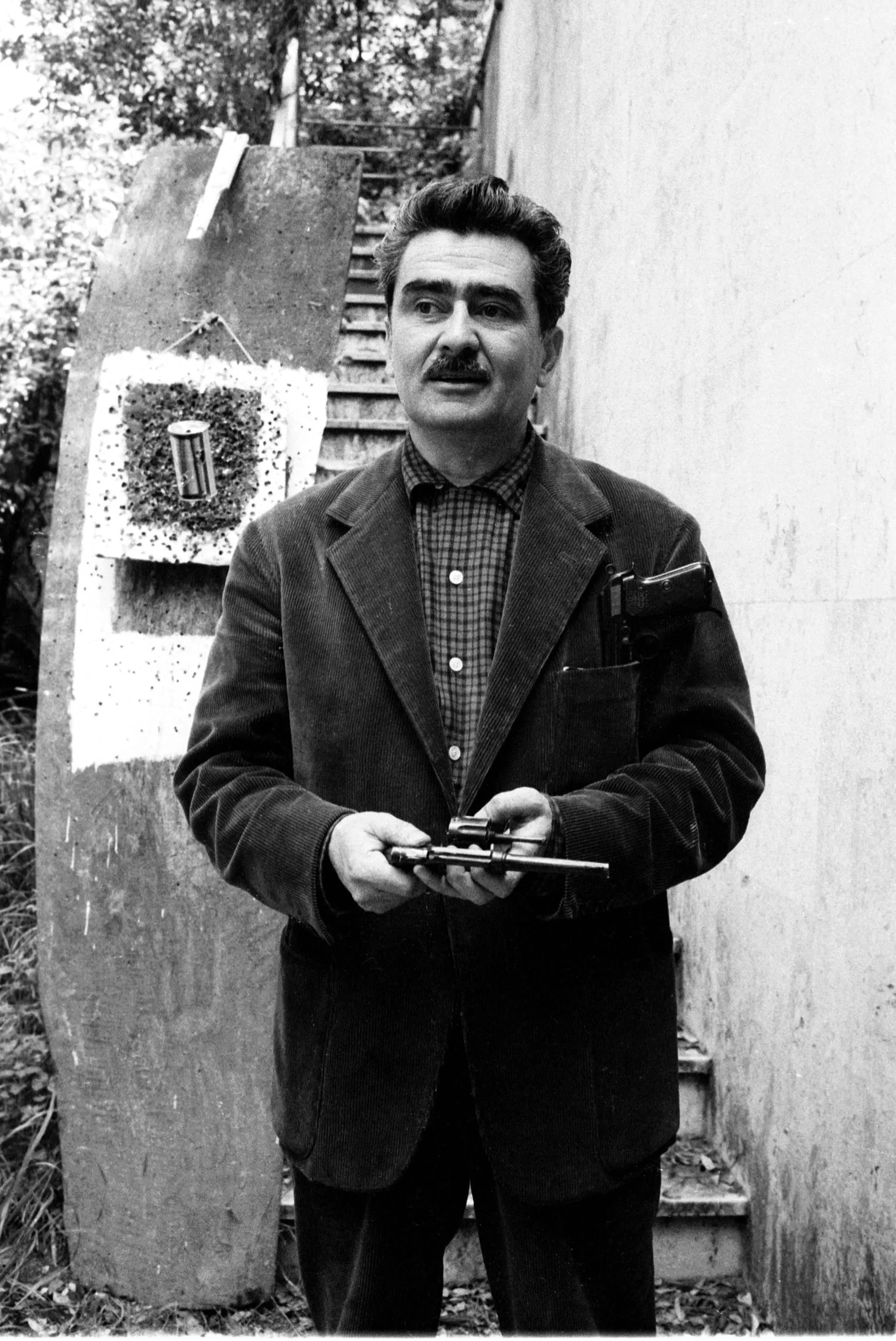 Black and white photograph of a heavyset man with a mustache standing outdoors, holding a small object, with a weathered concrete slab behind him