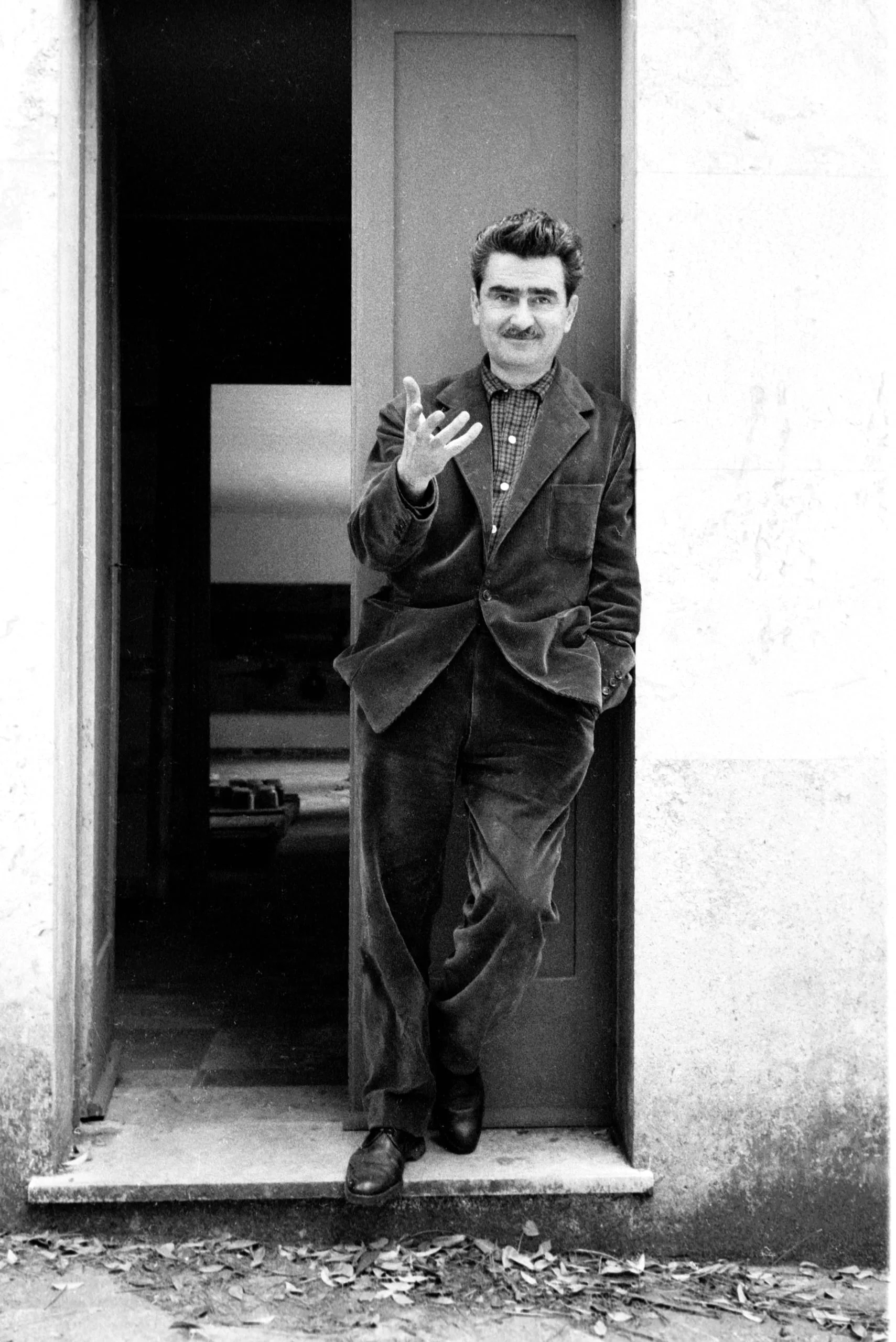 Black and white full-length photograph of a mustachioed man in a corduroy suit leaning in an open doorway, one hand raised mid-gesture