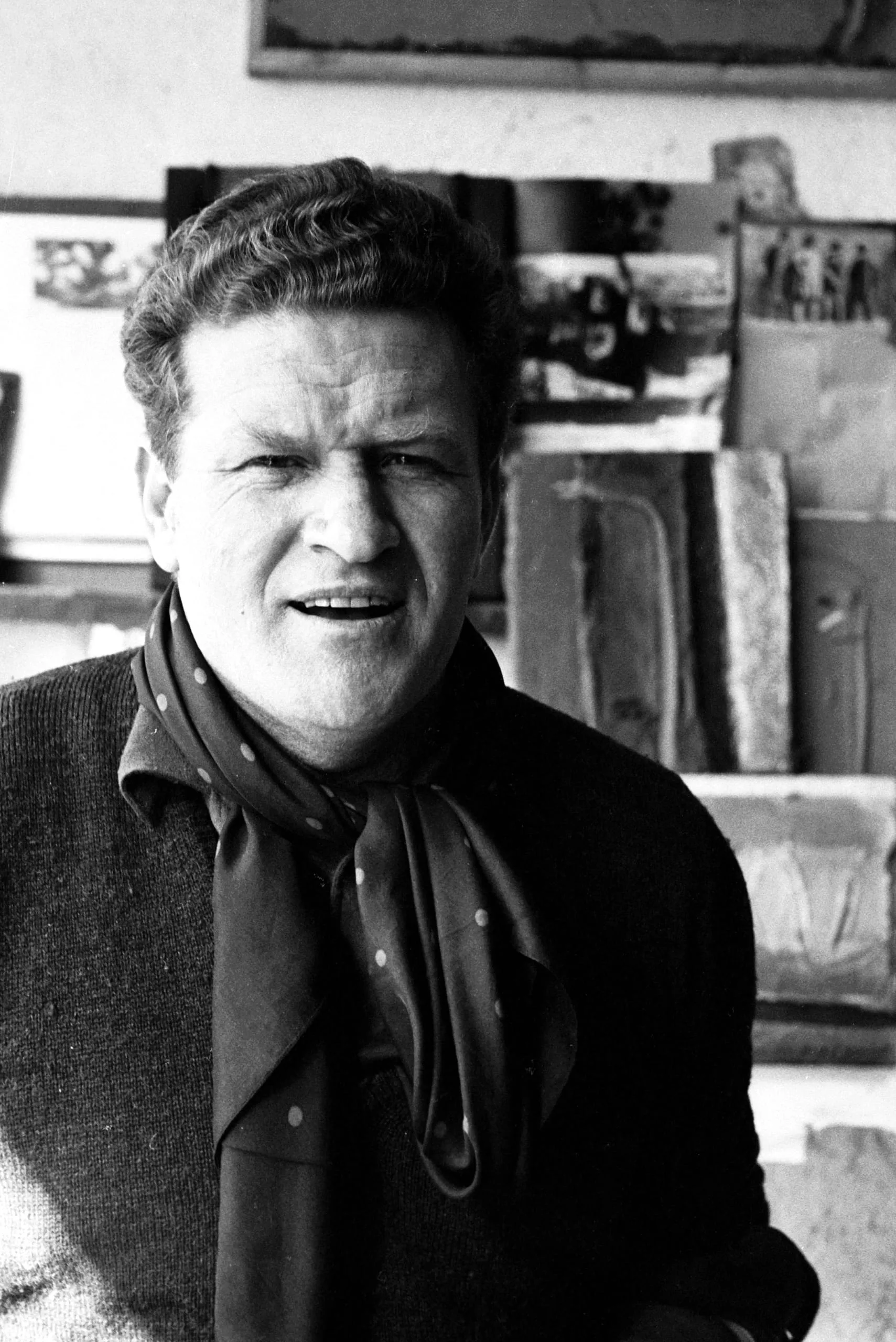 Black and white portrait photograph, chest-up view of a man with curly dark hair and a polka-dot scarf, artworks visible behind him