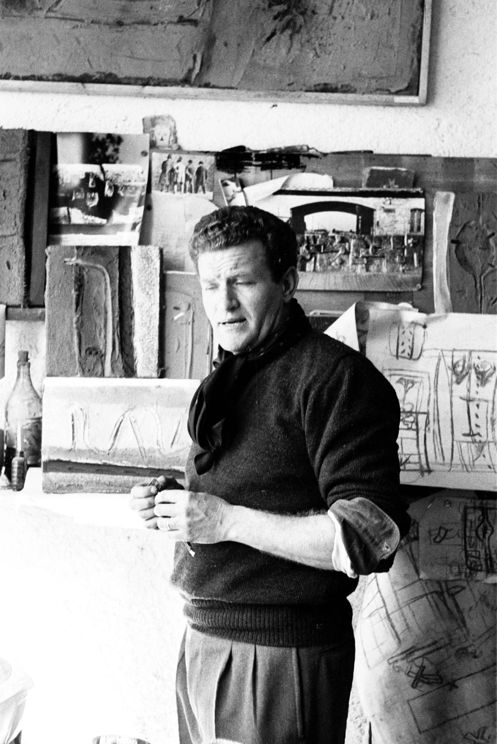 Black and white photograph of a man in a dark knit sweater standing in an artist's studio, surrounded by pinned photographs, sketches, and relief panels