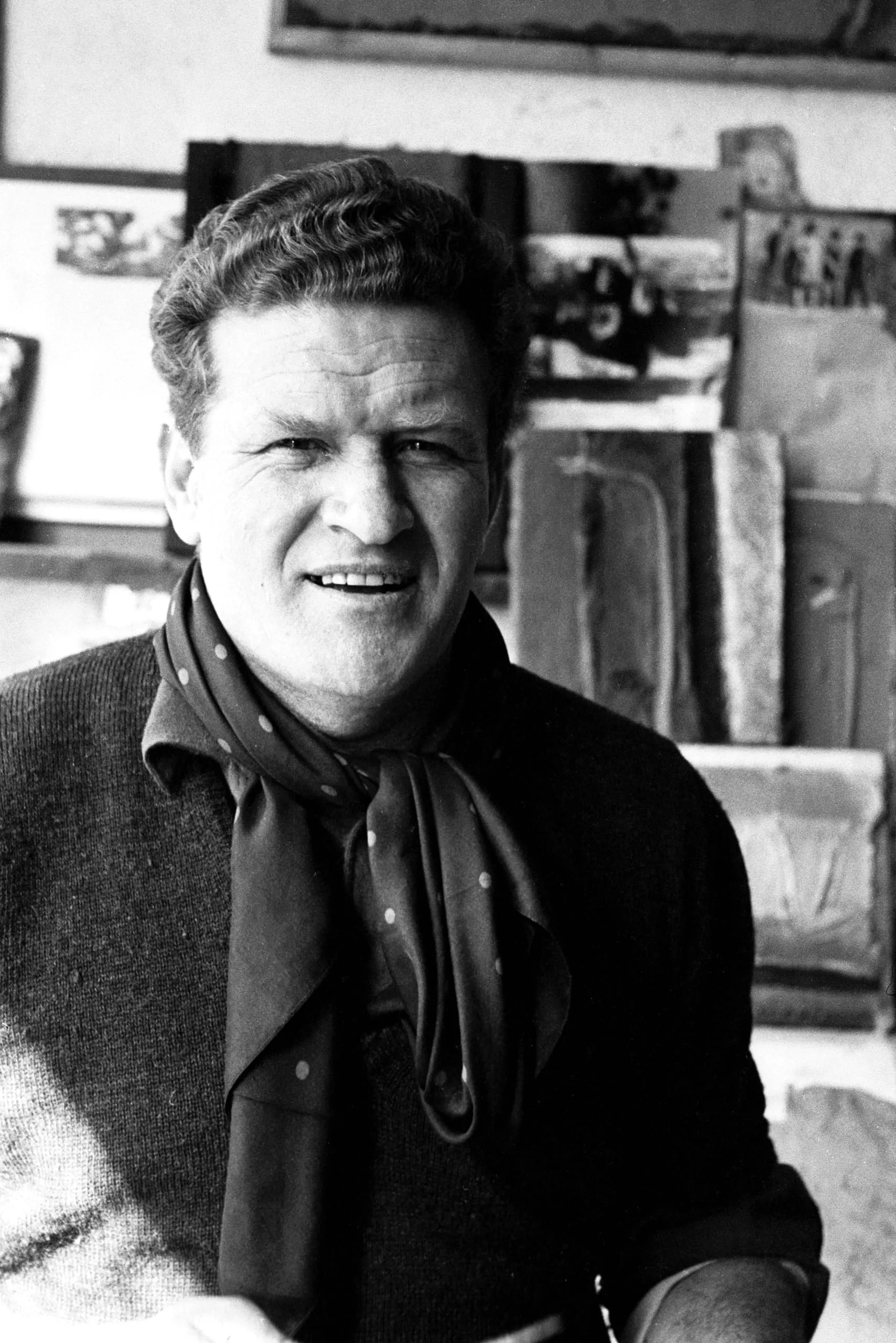 Black and white photograph, chest-up portrait of a curly-haired man in a dark knit sweater and polka-dot scarf, seated in what appears to be an artist's studio