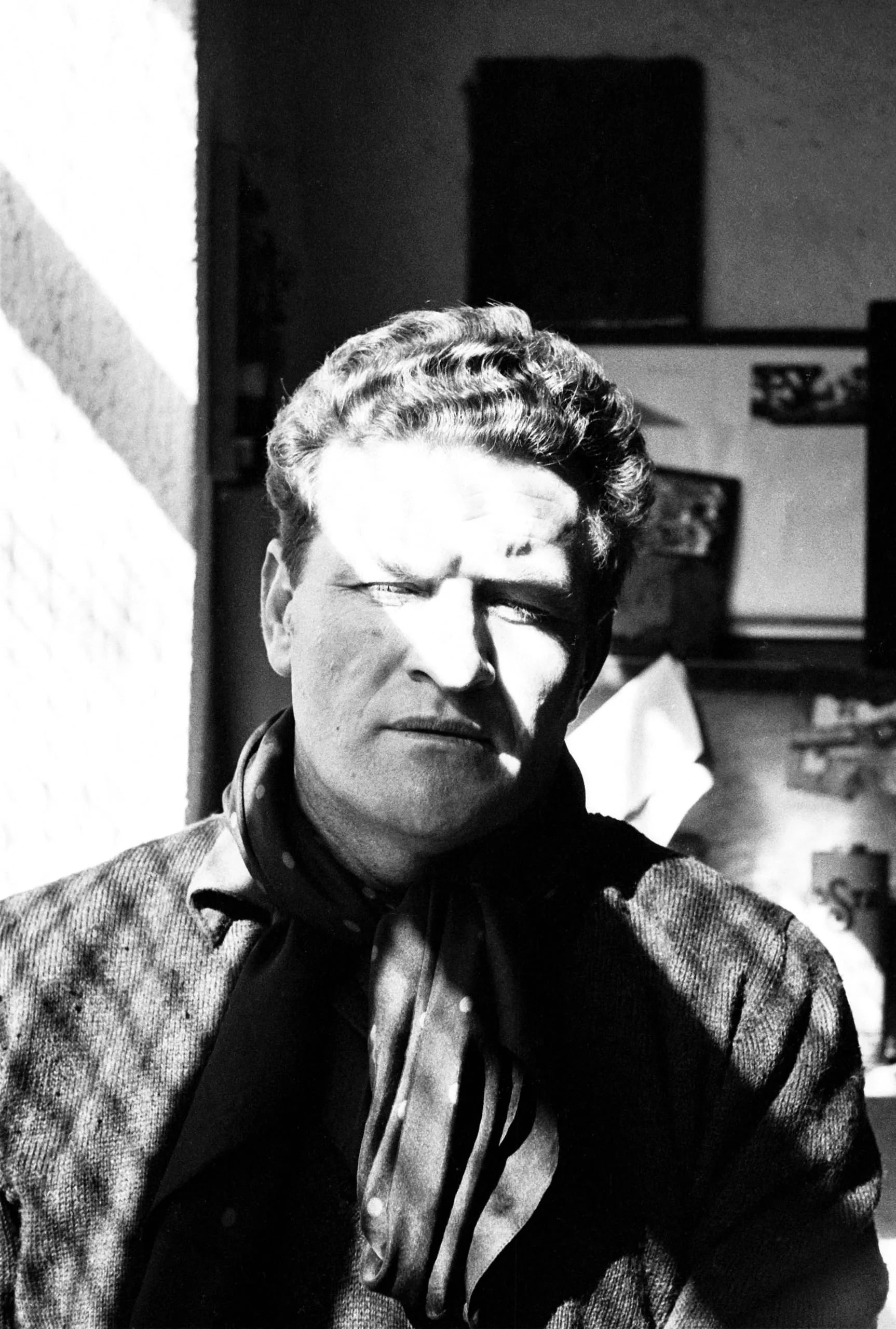 Black and white portrait photograph, man from the chest up, face half-obscured by a sharp diagonal shadow from strong directional sunlight, wearing a tweed jacket and dark neckerchief