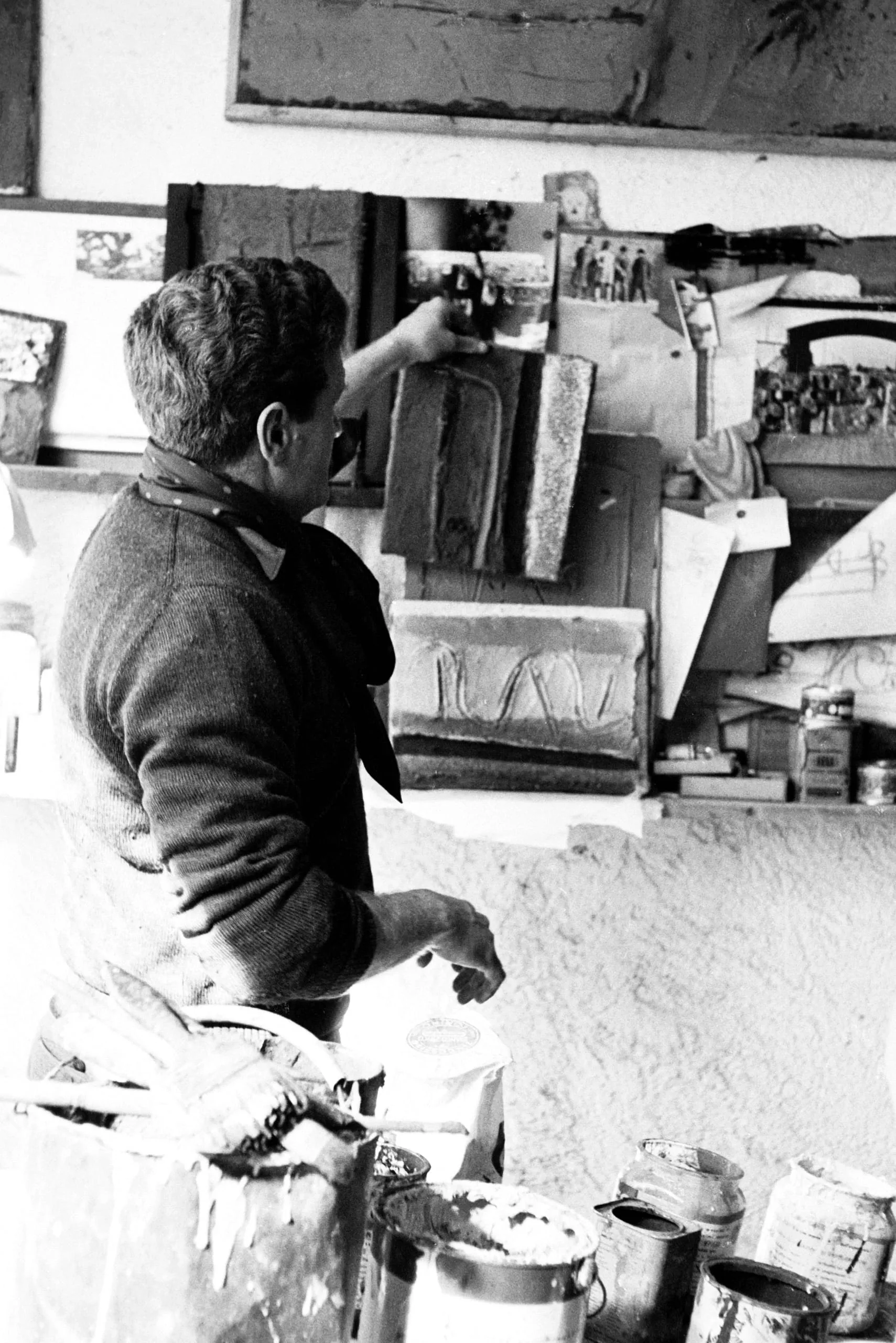 Black and white photograph of a man from behind working at a studio wall covered with large carved relief blocks and pinned images, paint cans in the foreground