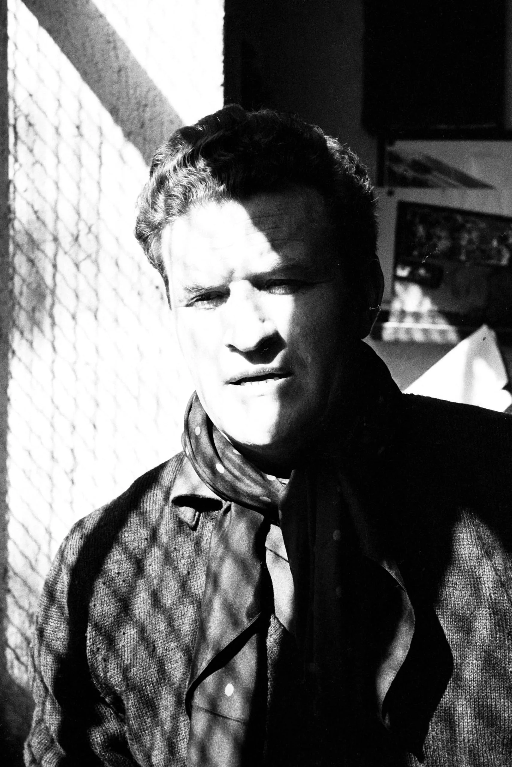 Black and white portrait photograph, man from the chest up in three-quarter profile, harshly lit from the upper left with deep shadows across half his face
