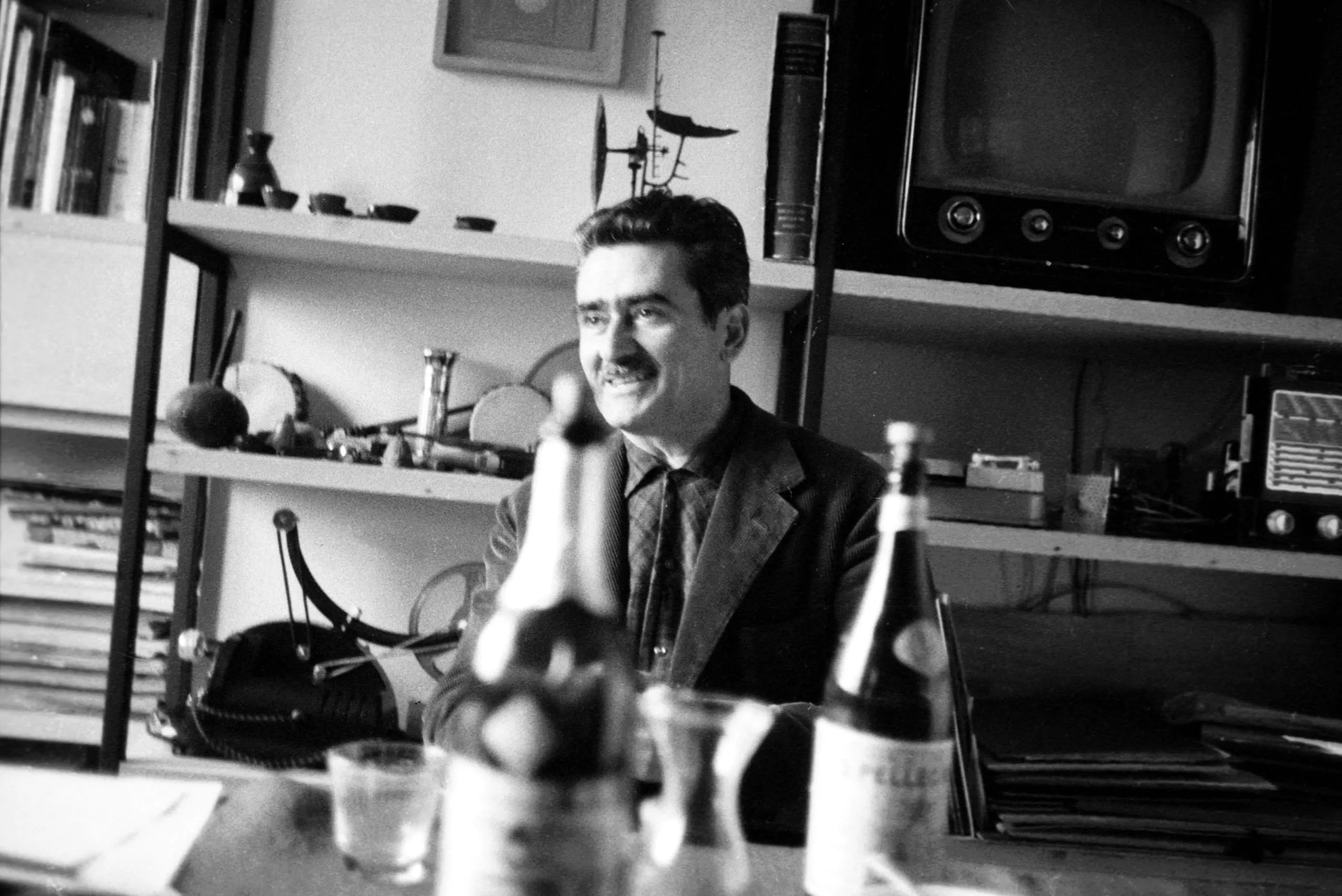 Black and white photograph of a dark-haired man with a mustache seated at a desk, laughing, with blurred bottles in the foreground and shelves holding a vintage television behind him