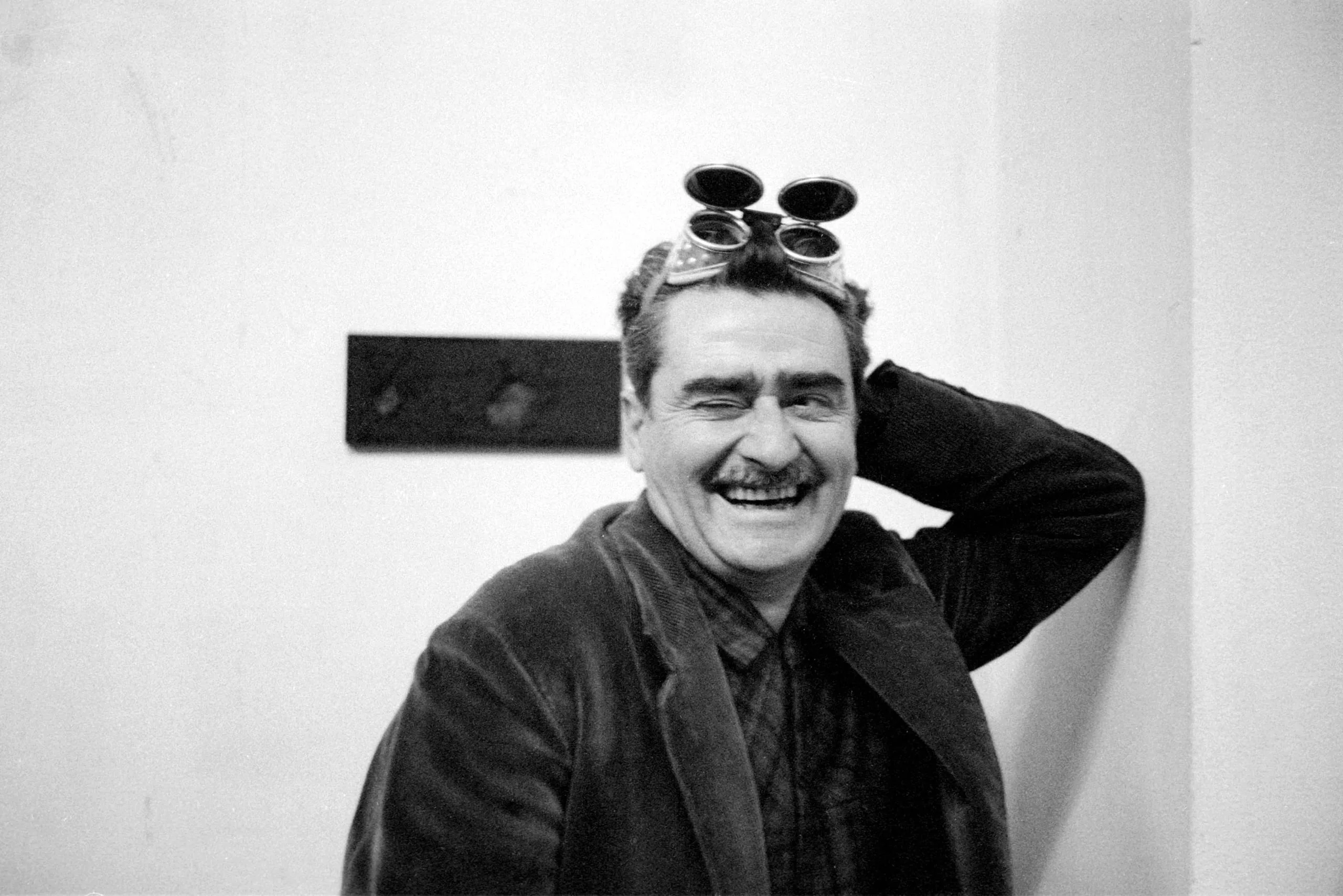 Black and white photograph of a laughing white man with industrial goggles pushed up on his head, hand raised behind his neck, wearing a dark jacket