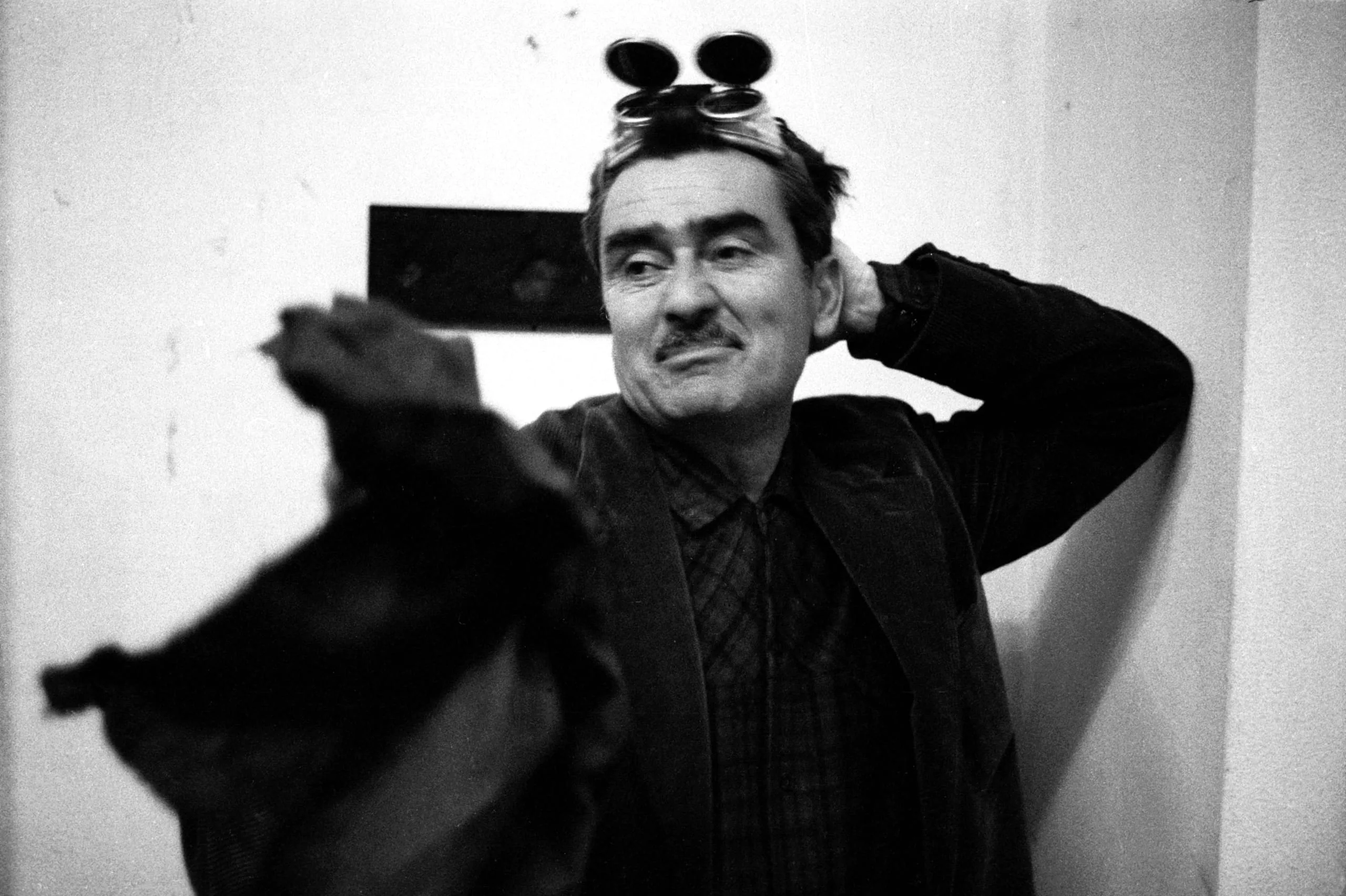 Black and white photograph, a white man from the chest up leaning against a wall, hands clasped behind his head, round goggles pushed up on his forehead, looking upward