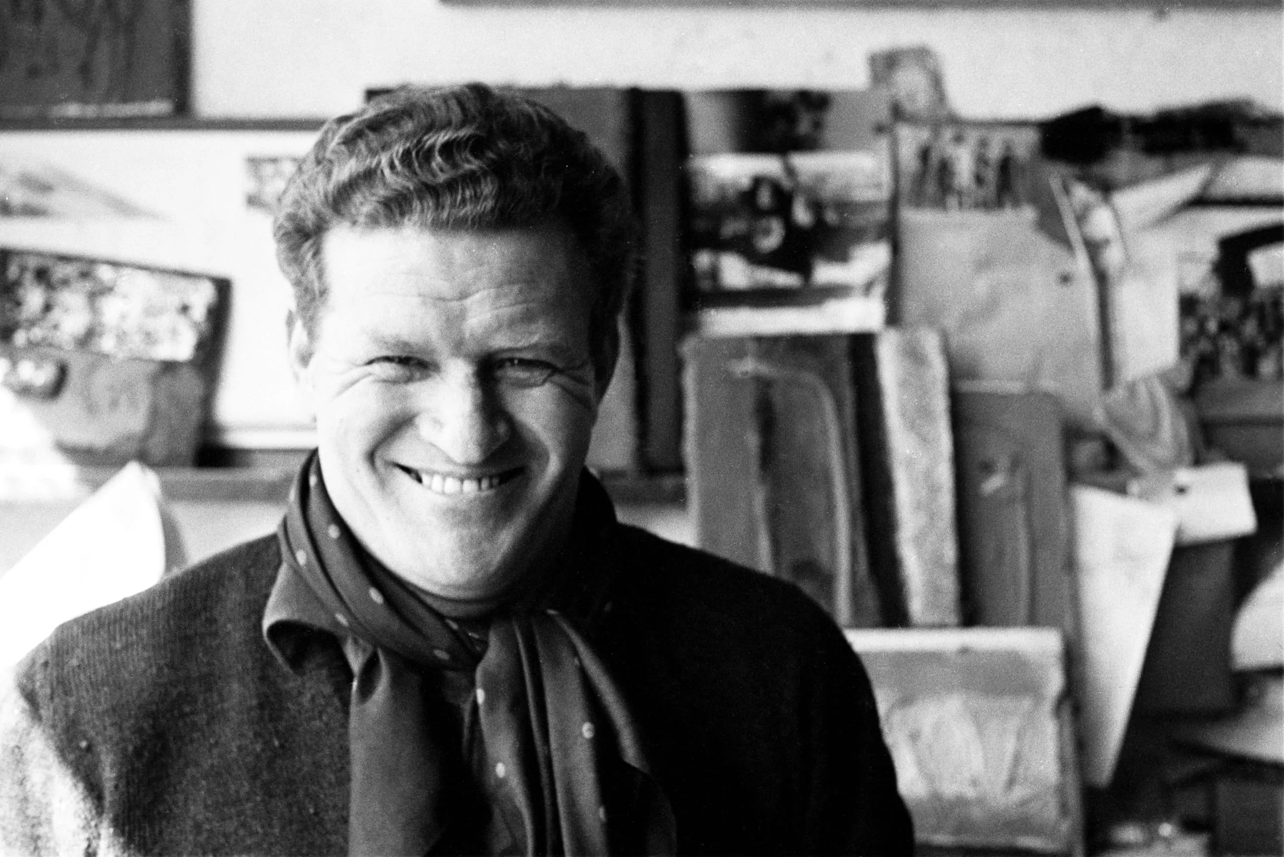 Black and white photograph, chest-up portrait of a smiling white man with wavy hair, wearing a wool jacket and loosely knotted scarf, studio space visible behind him