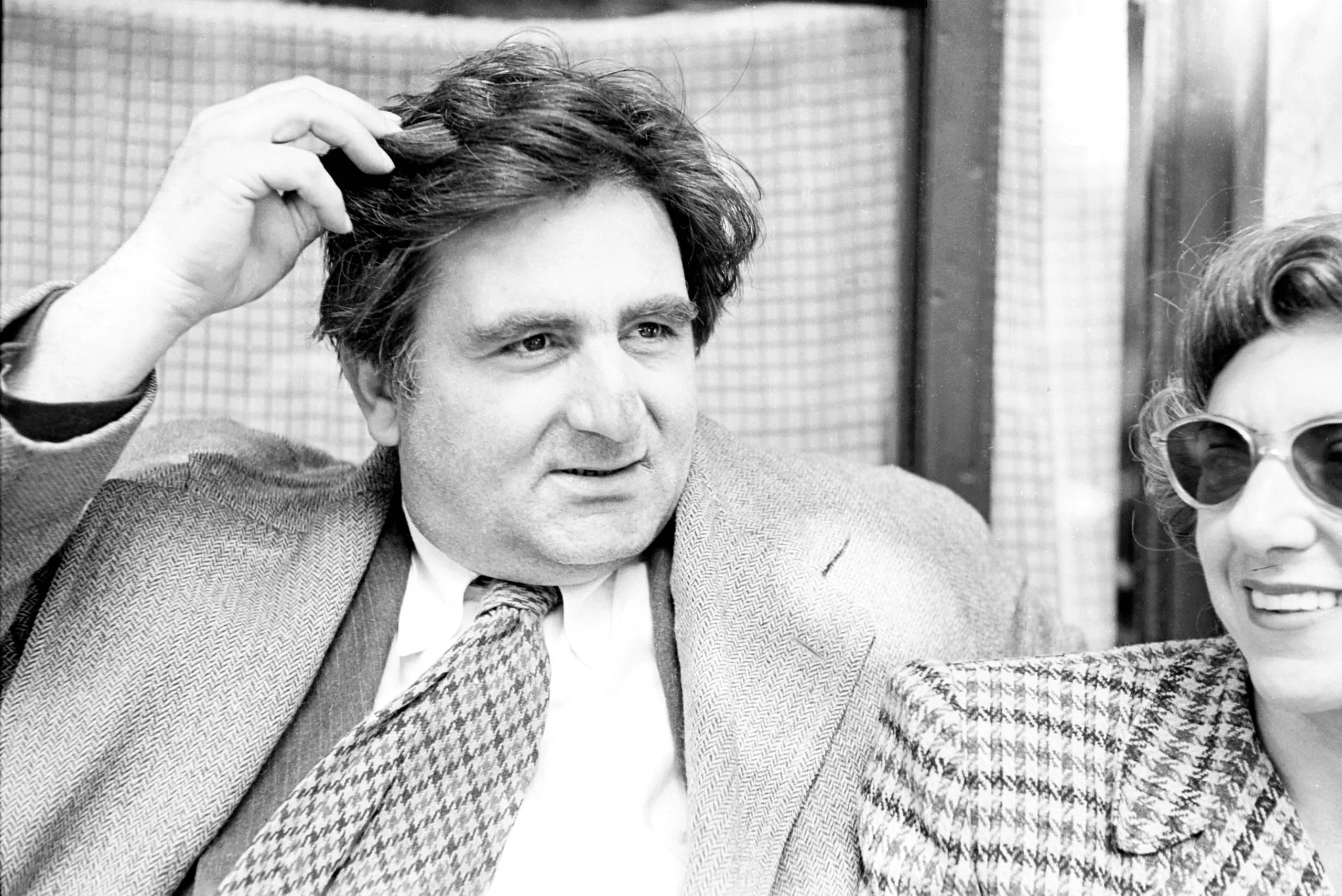 Black and white photograph, a man with tousled hair in a tweed blazer raises one hand to his head, a smiling woman in sunglasses visible at right