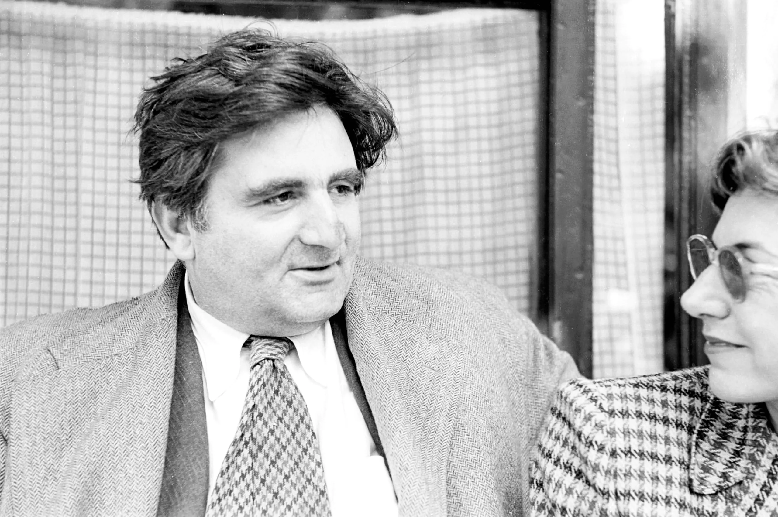Black and white photograph, man with dark hair in a tweed sport coat and wide tie shown in three-quarter profile, second figure partially visible at right edge