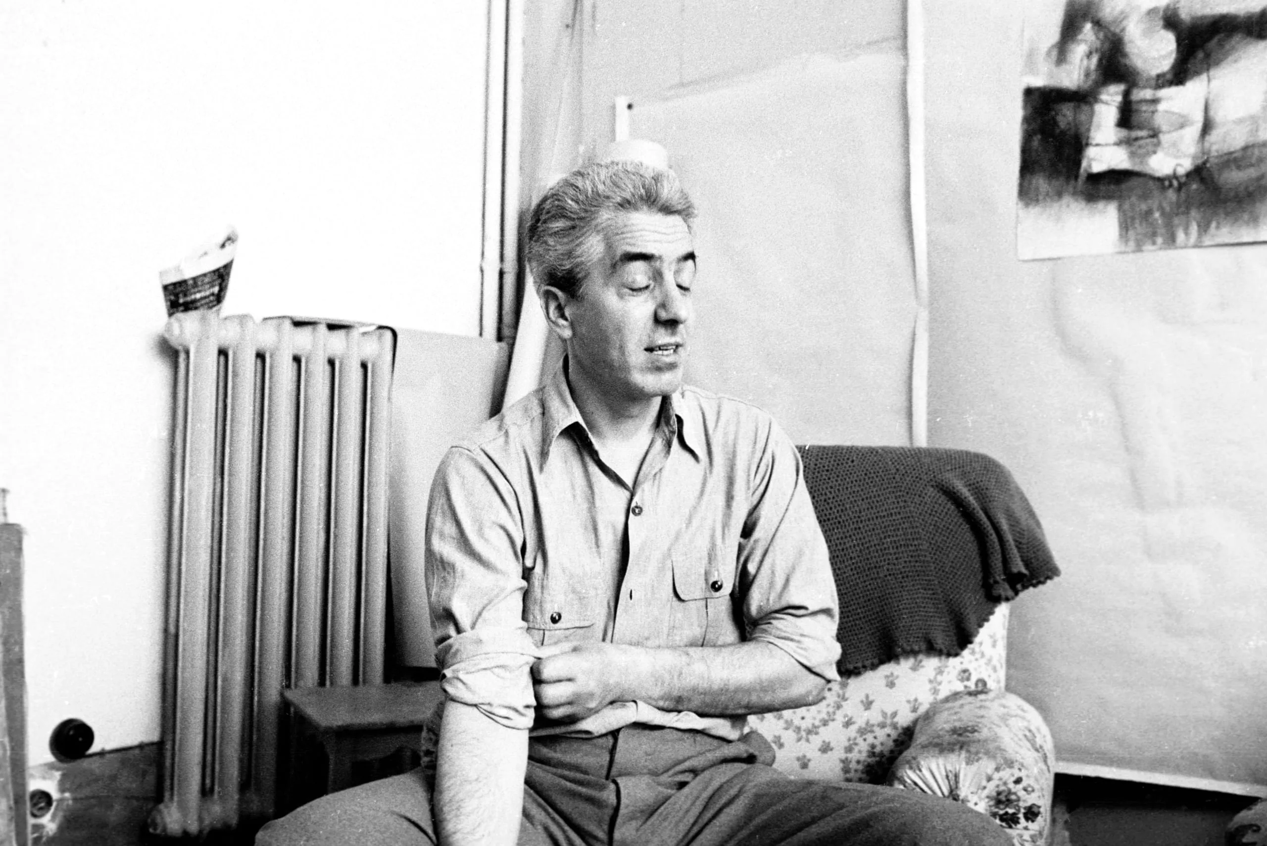 Black and white photograph of a seated white man with bandaged forearm, arms crossed, looking downward, in a casual interior with a radiator and artwork on the walls