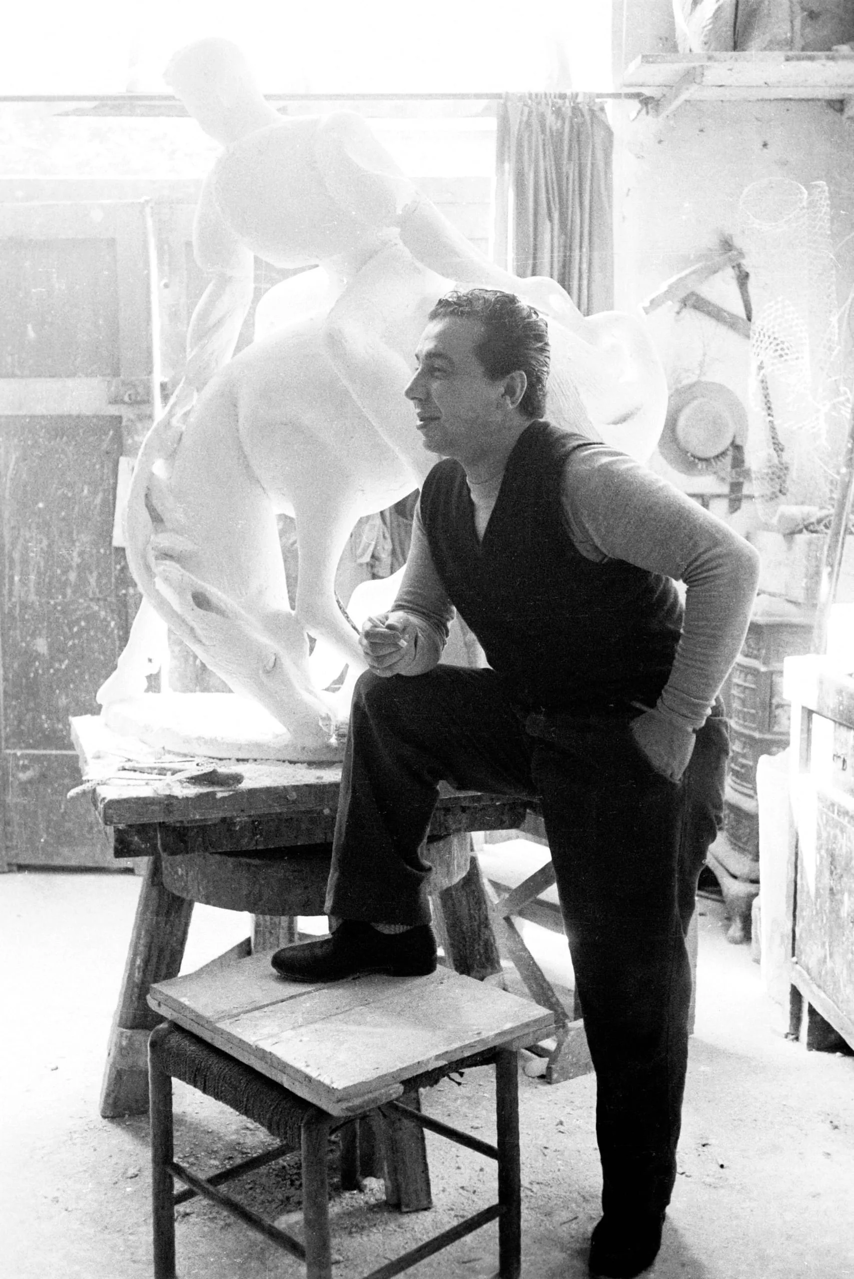 Black and white photograph of a dark-haired man in a vest seated on a wooden sawhorse beside a large white plaster sculpture in an artist's studio
