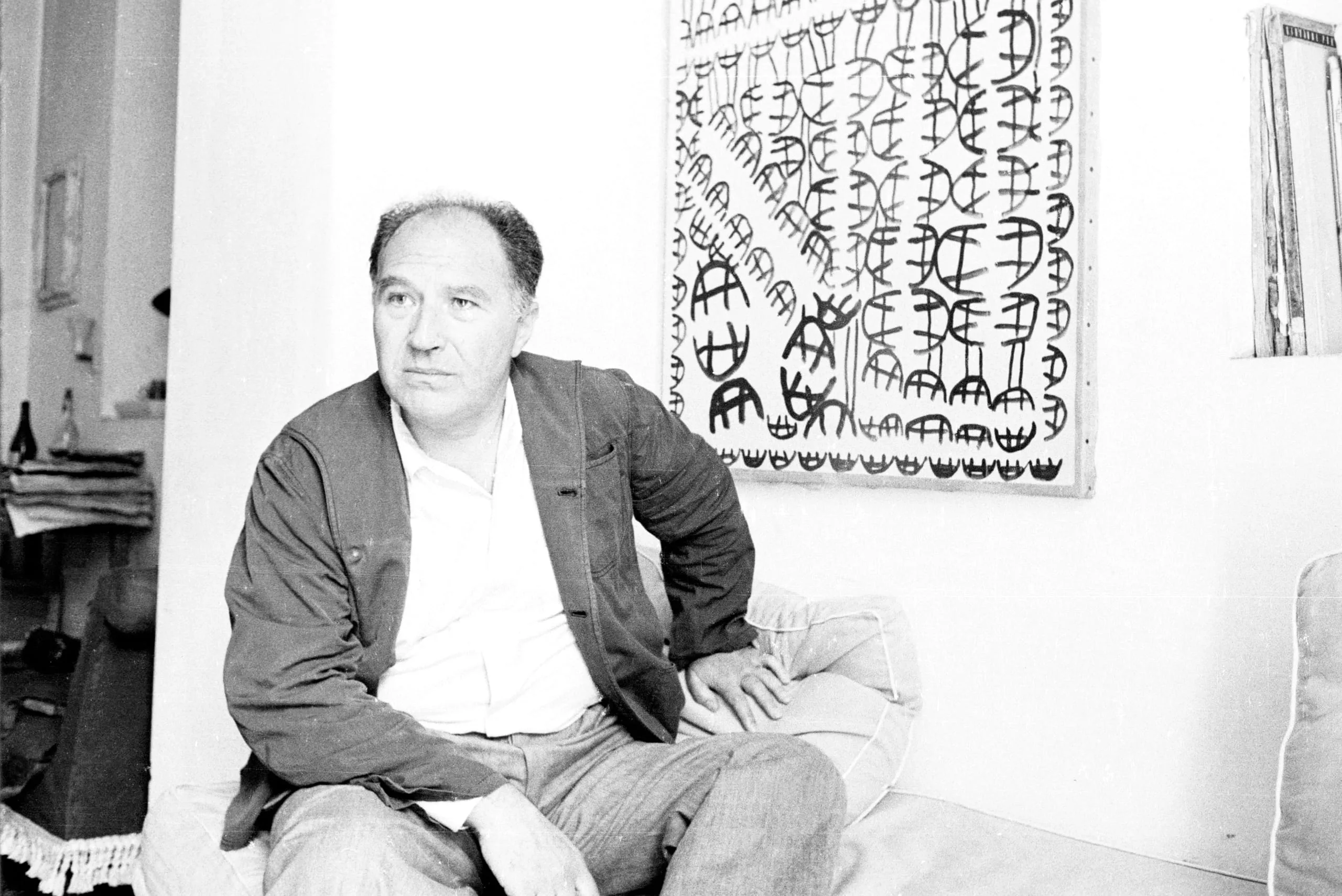Black and white photograph of a white man seated on a sofa, body angled right, wearing a jacket over a collared shirt, with a large abstract painting of repeated black symbols on the wall behind him