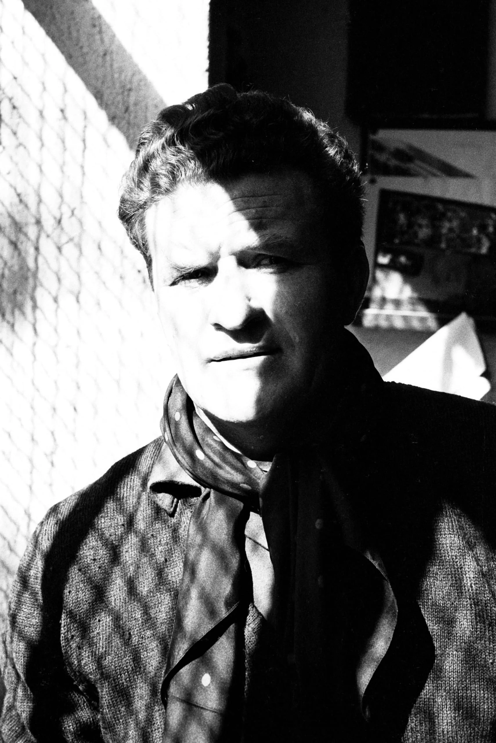 Black and white portrait photograph, man from the chest up, dramatically lit from the left, wearing a knit jacket and loosely knotted scarf, chain-link mesh wall behind him