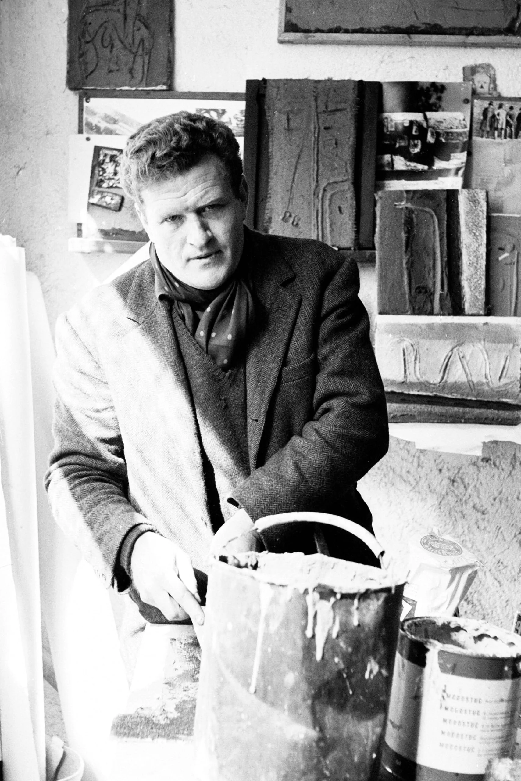 Black and white photograph of a man in a tweed jacket leaning over paint-covered buckets in an artist's studio, looking directly at the camera