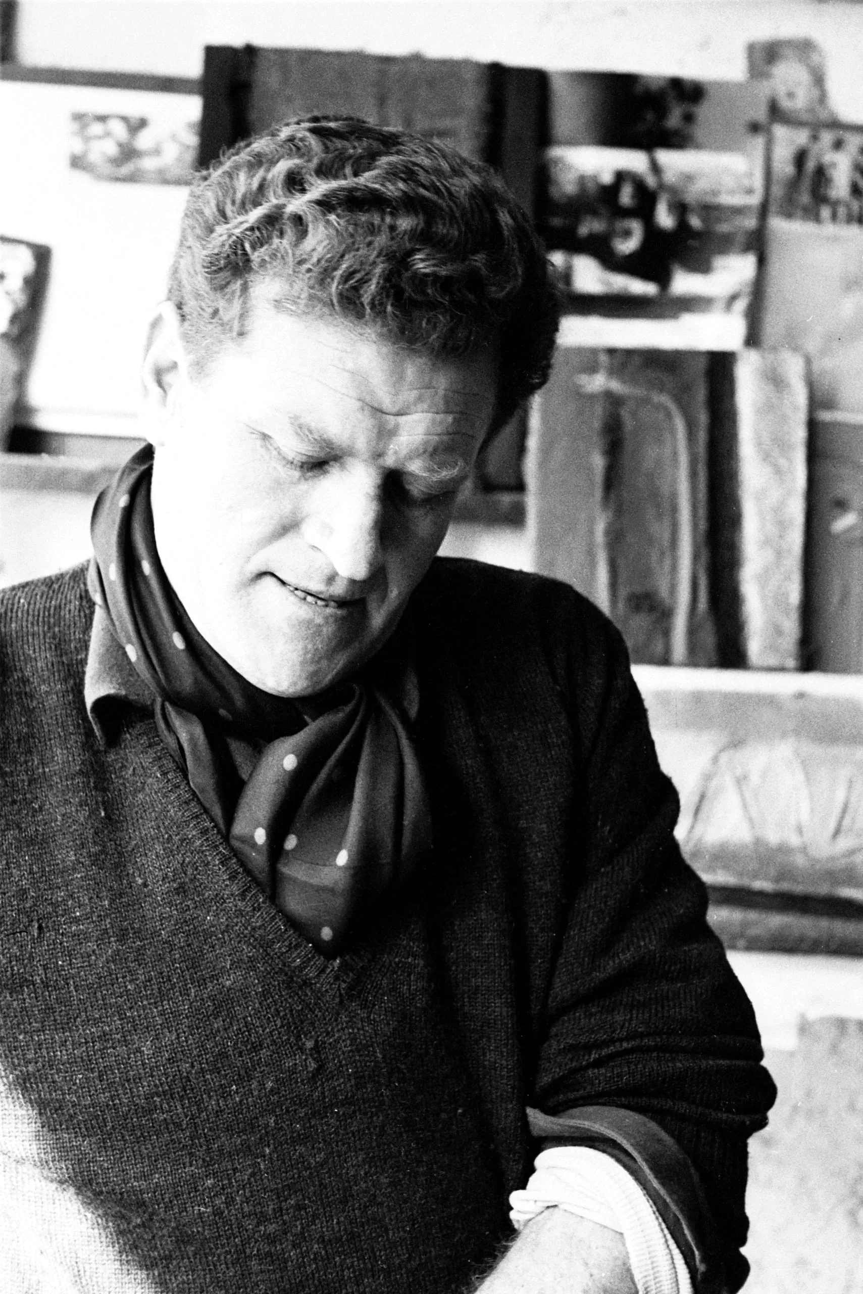 Black and white photograph of a man from the waist up, looking downward, wearing a dark V-neck sweater and polka-dot neckerchief, with stacked rectangular blocks and propped images visible behind him