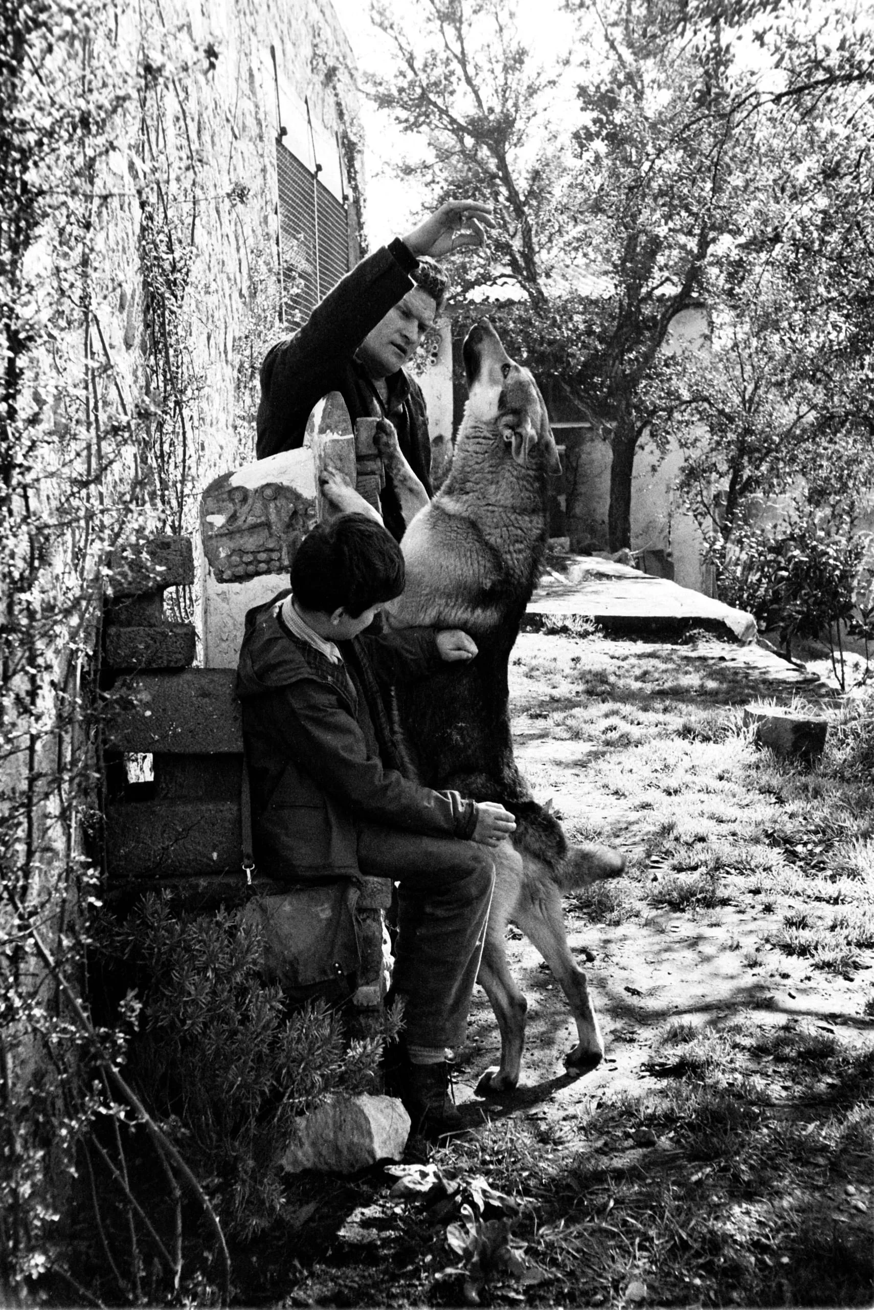 Black and white photograph of a man and boy with a large dog rearing up on its hind legs, outdoors beside a stone wall