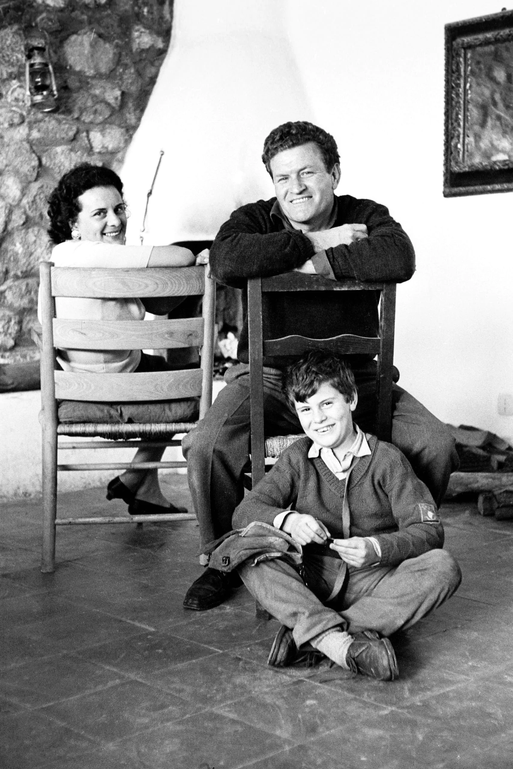 Black and white photograph of two white adults and a child in a stone-walled interior, the man leaning over a wooden chair back, the child seated cross-legged on a tile floor below