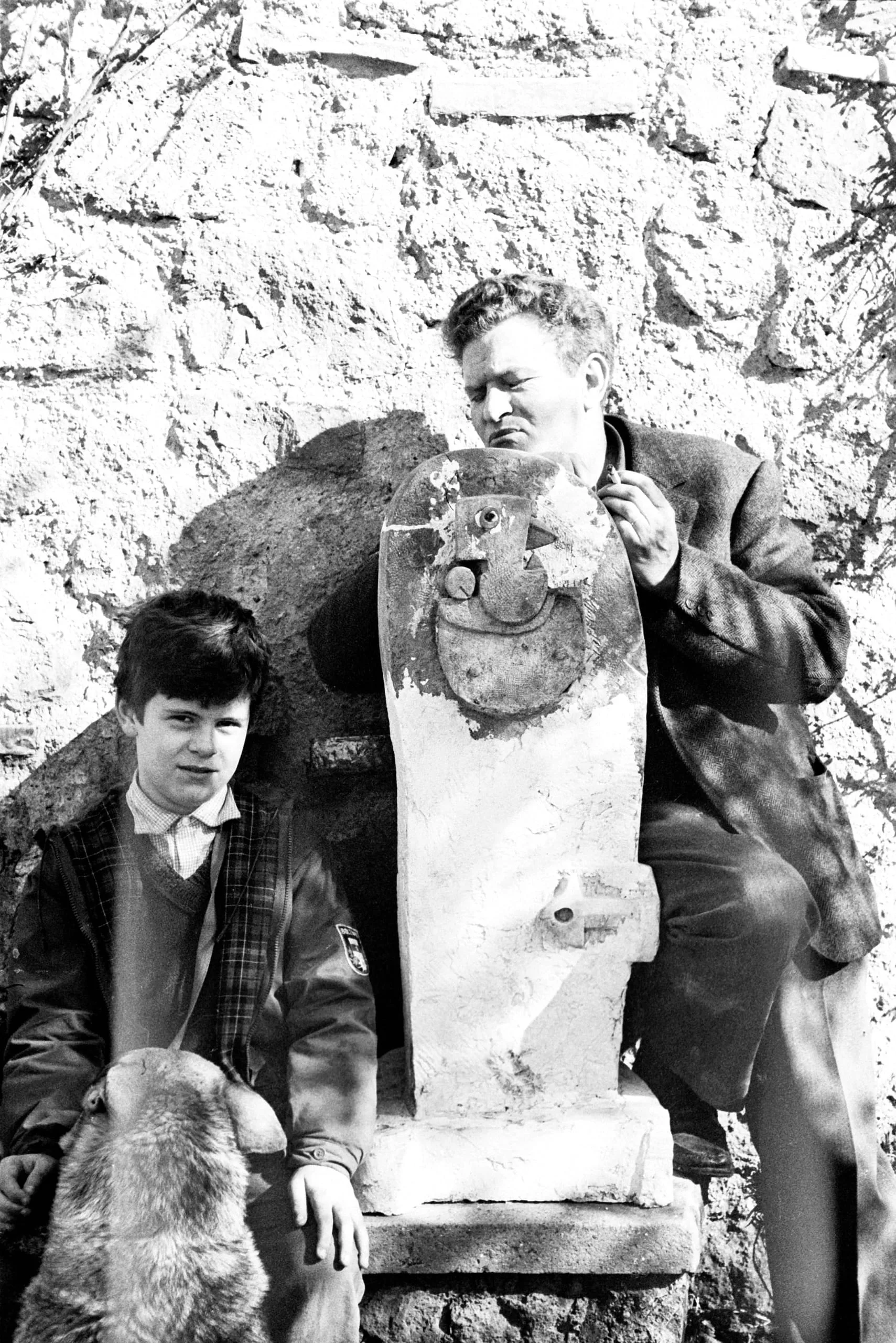 Black and white photograph of a teenager and an adult flanking an abstract stone sculpture against a rough whitewashed stone wall