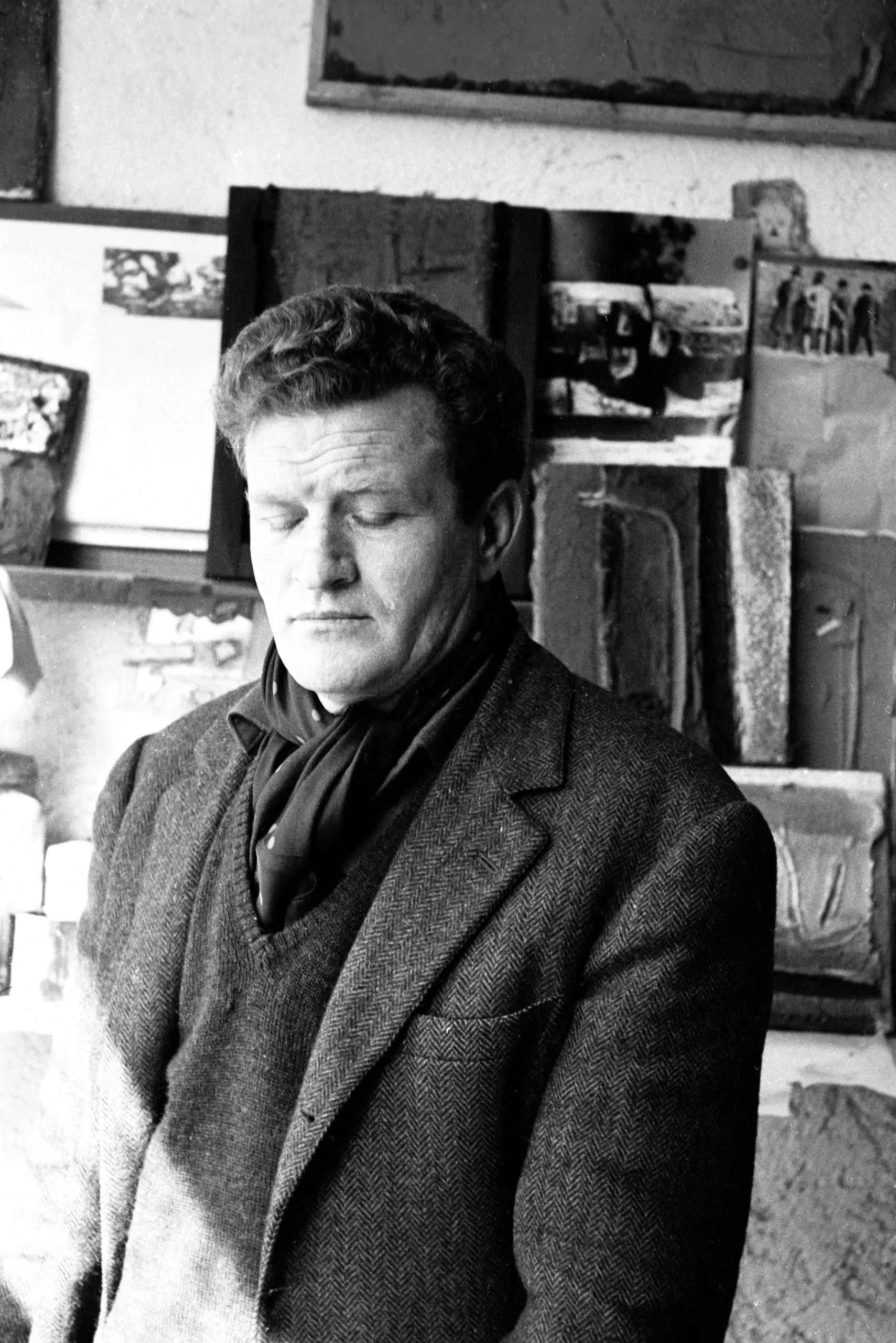 Black and white photograph, waist-up portrait of a man in a herringbone tweed jacket with eyes downcast, studio wall with stone slabs and pinned images behind him