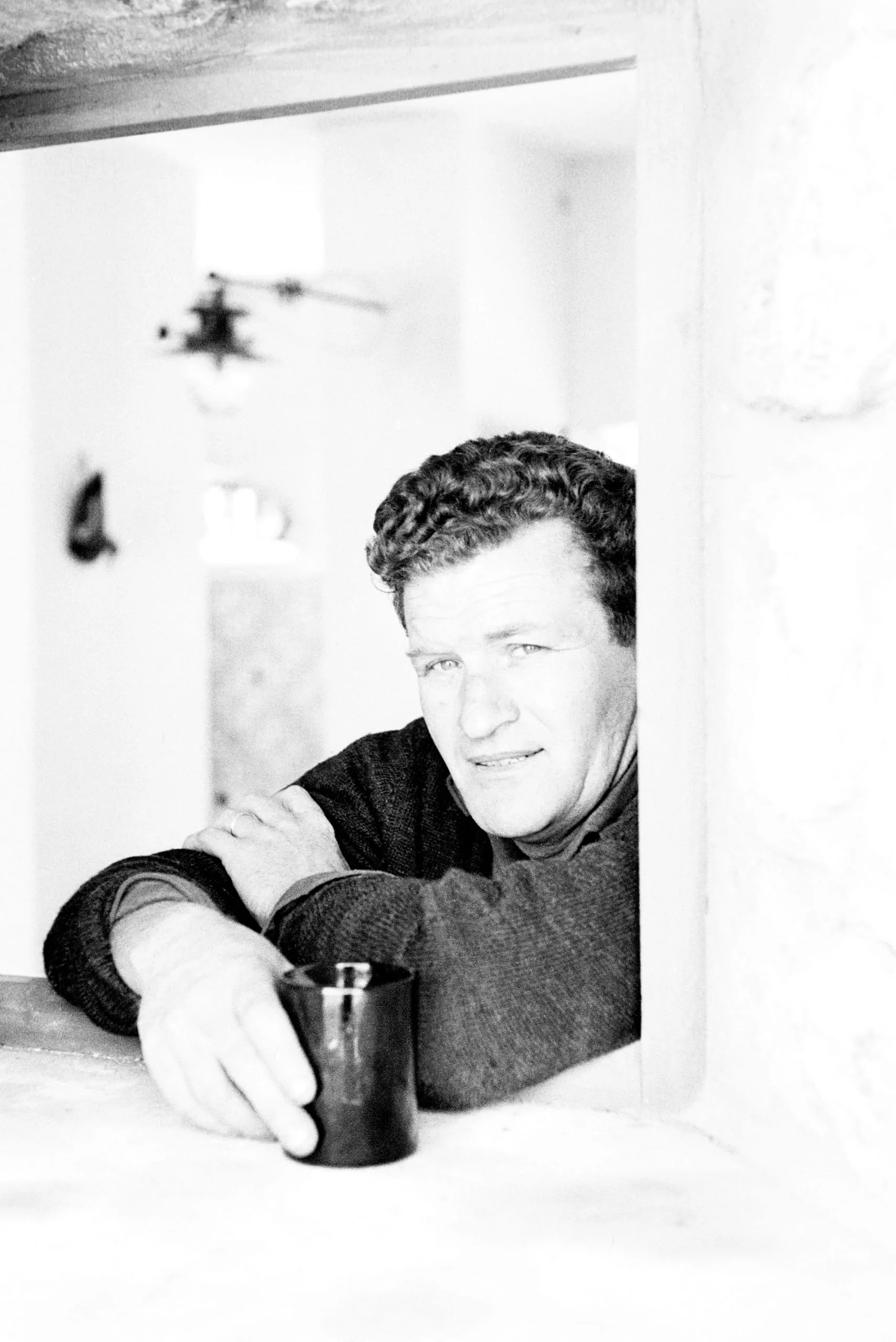 Black and white photograph of a man in a dark knit sweater leaning through a square opening in a thick white wall, one arm extended toward the camera beside a small dark cup