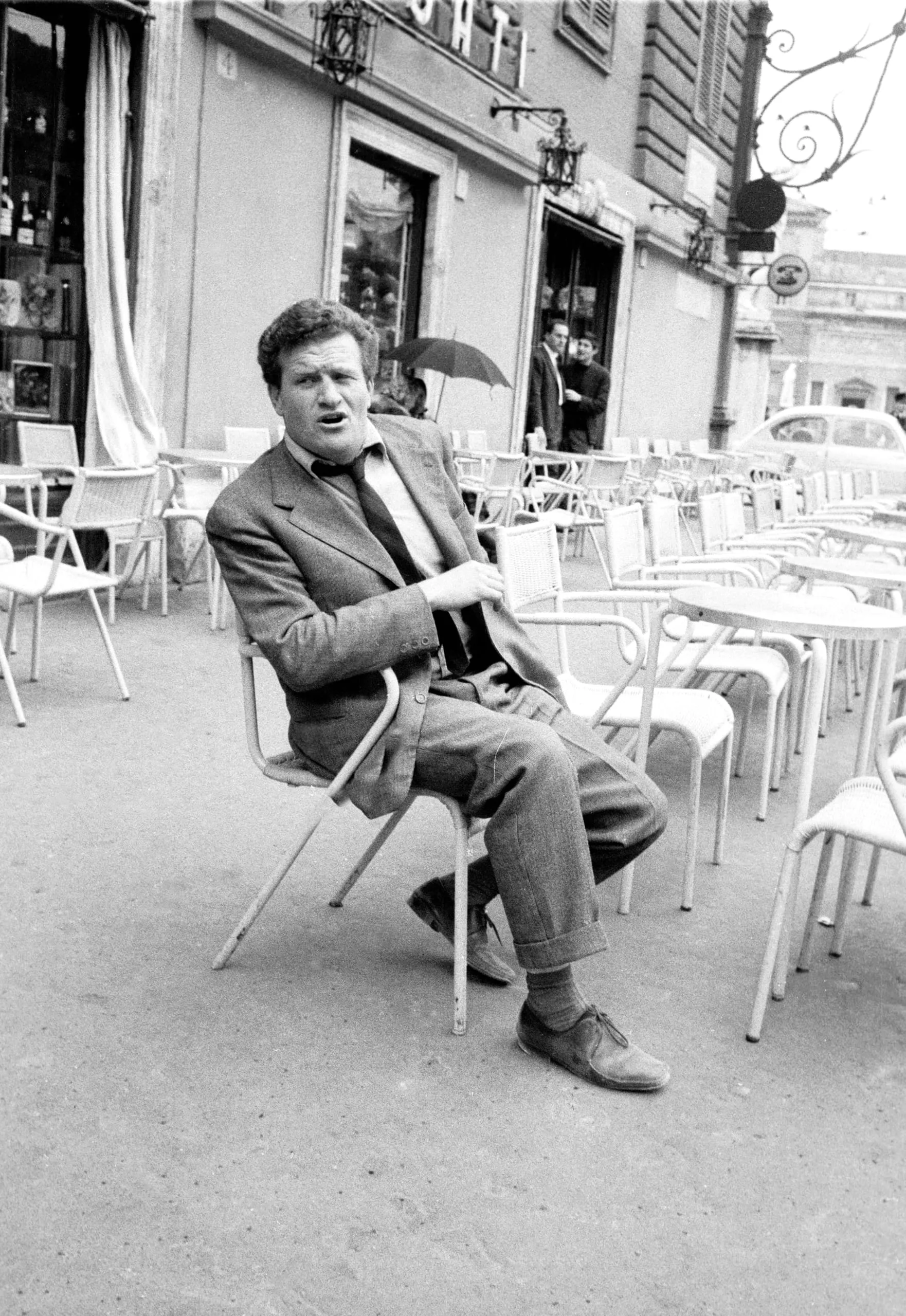 Black and white photograph of a white man in a sport coat and loosened tie, seated on a tilted metal café chair at an outdoor terrace, mouth open mid-speech