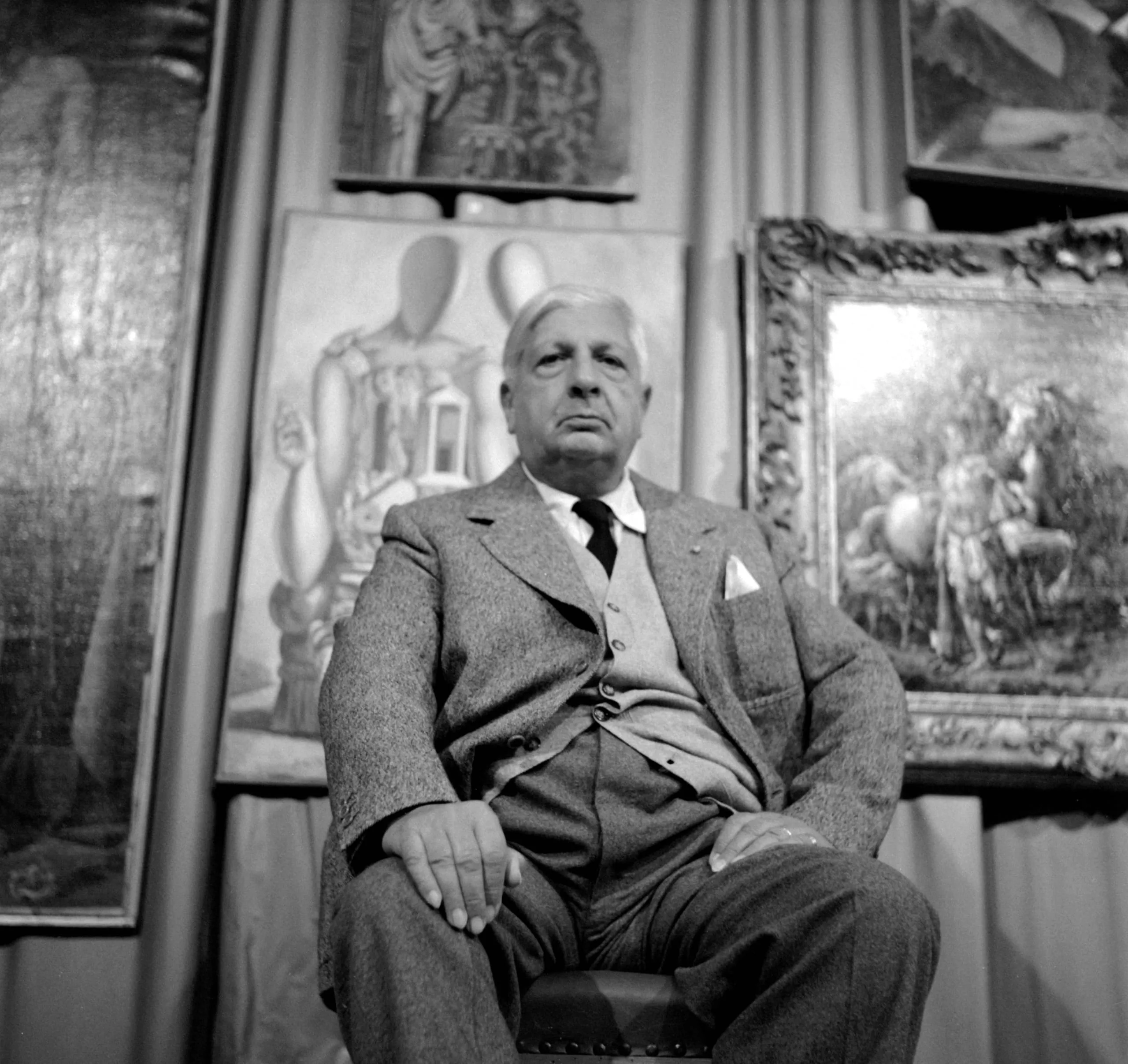 Black and white photograph of a heavyset white man in a three-piece wool suit seated before several framed paintings, looking directly at the camera