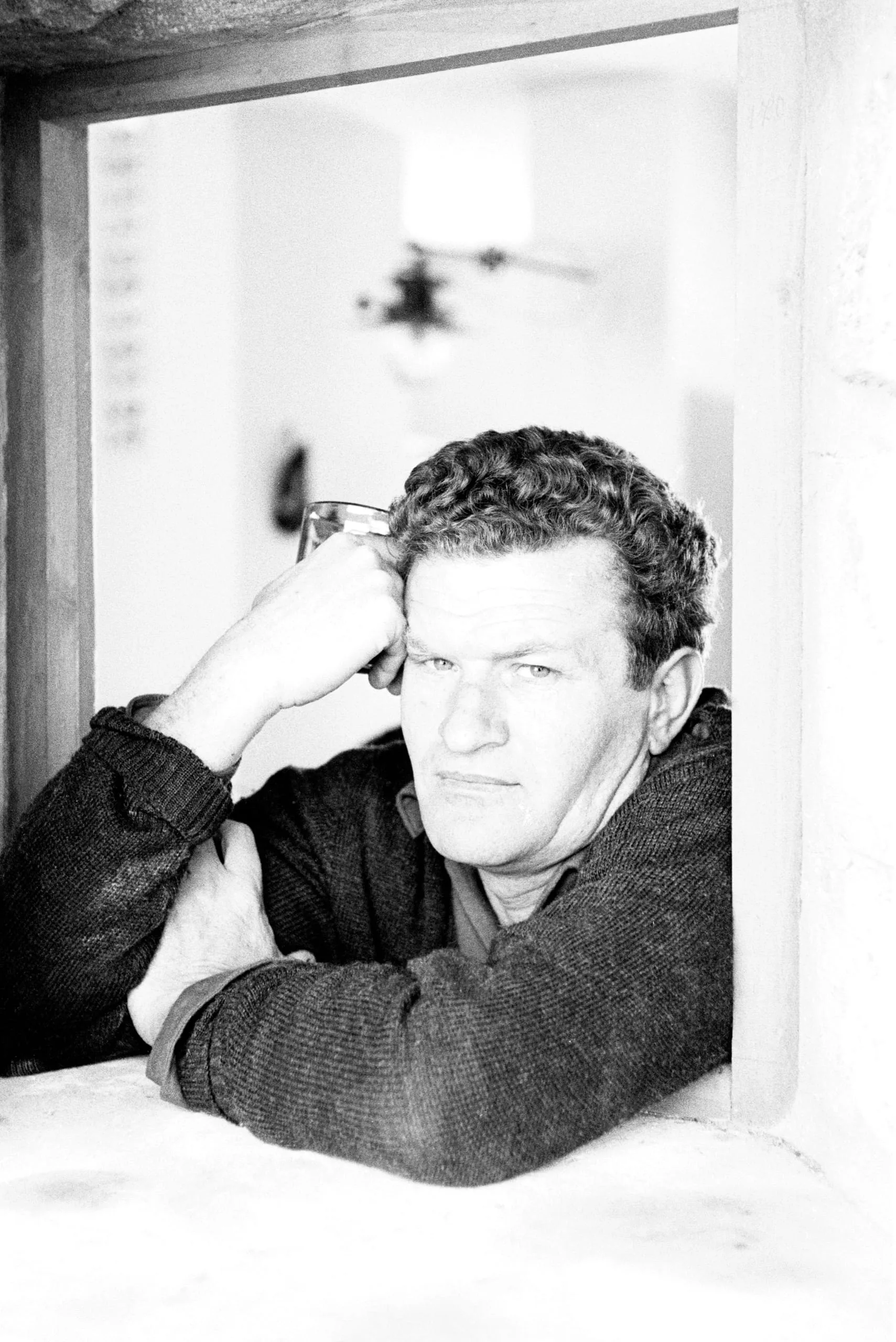 Black and white photograph, white man from the chest up leaning on a stone ledge framed by a thick window opening, hand raised to temple holding glasses