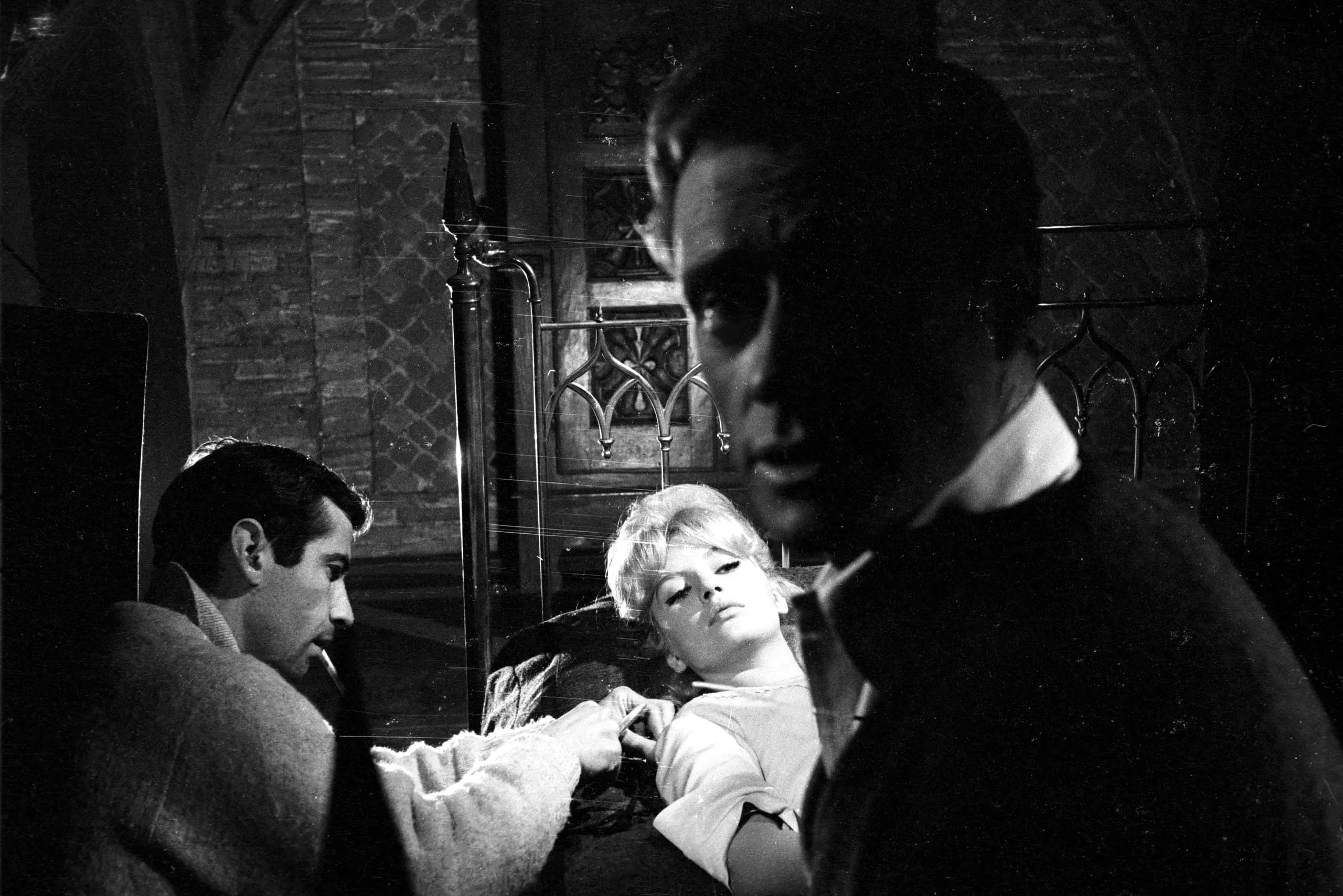 High-contrast black and white photograph of three figures in a shadowy interior: two men flank a reclined woman with teased hair, dramatic chiaroscuro lighting