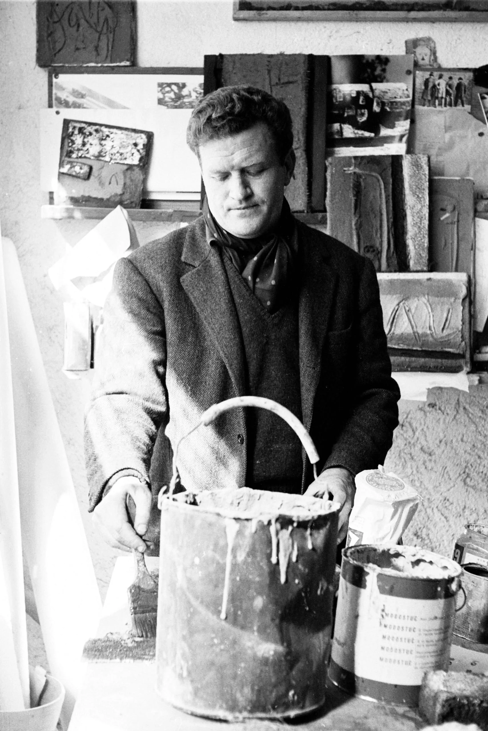 Black and white photograph of a man in a tweed blazer looking down into a paint-encrusted bucket in an artist's studio