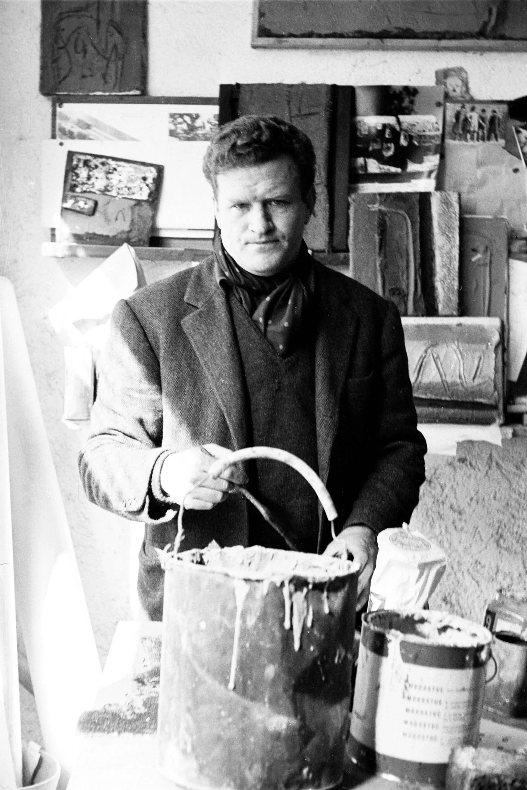 Black and white photograph of a man in a wool blazer and knotted scarf, holding a curved tool over a paint-encrusted bucket in an artist's studio