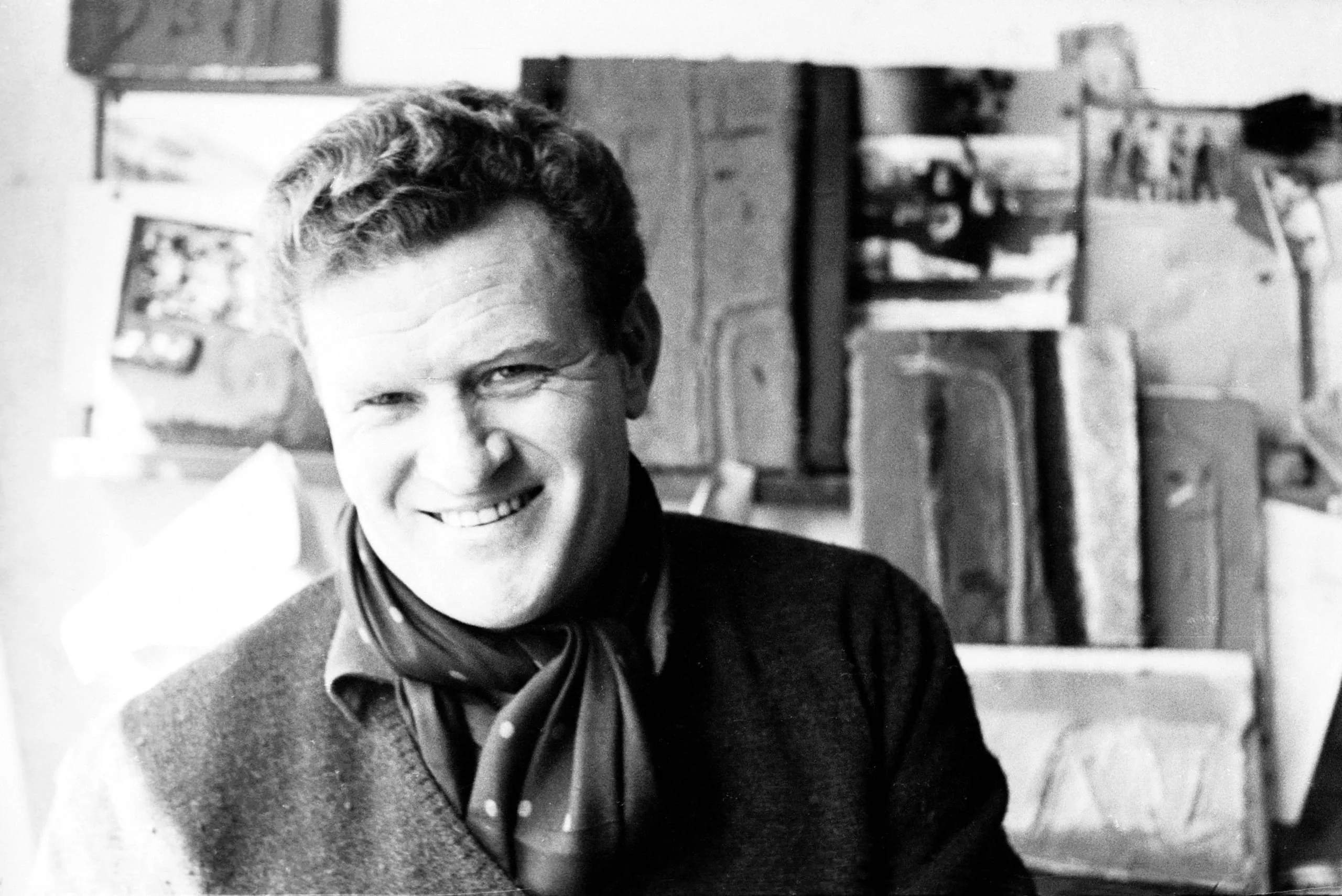 Black and white photograph, chest-up portrait of a smiling white man with curly hair, wearing a wool sweater and scarf, studio wall with artworks visible behind him
