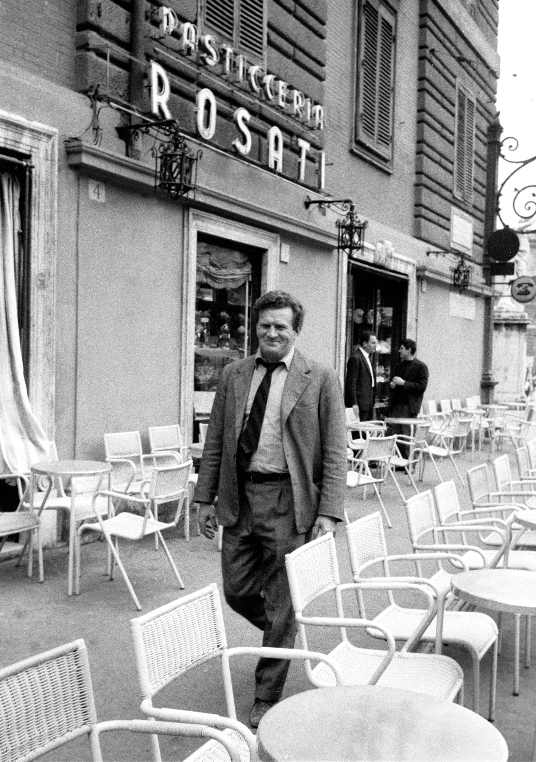 Black and white photograph of a smiling white man in a blazer and loosened tie standing full-length on a café terrace, with empty metal chairs and a 'PASTICCERIA ROSATI' sign behind him