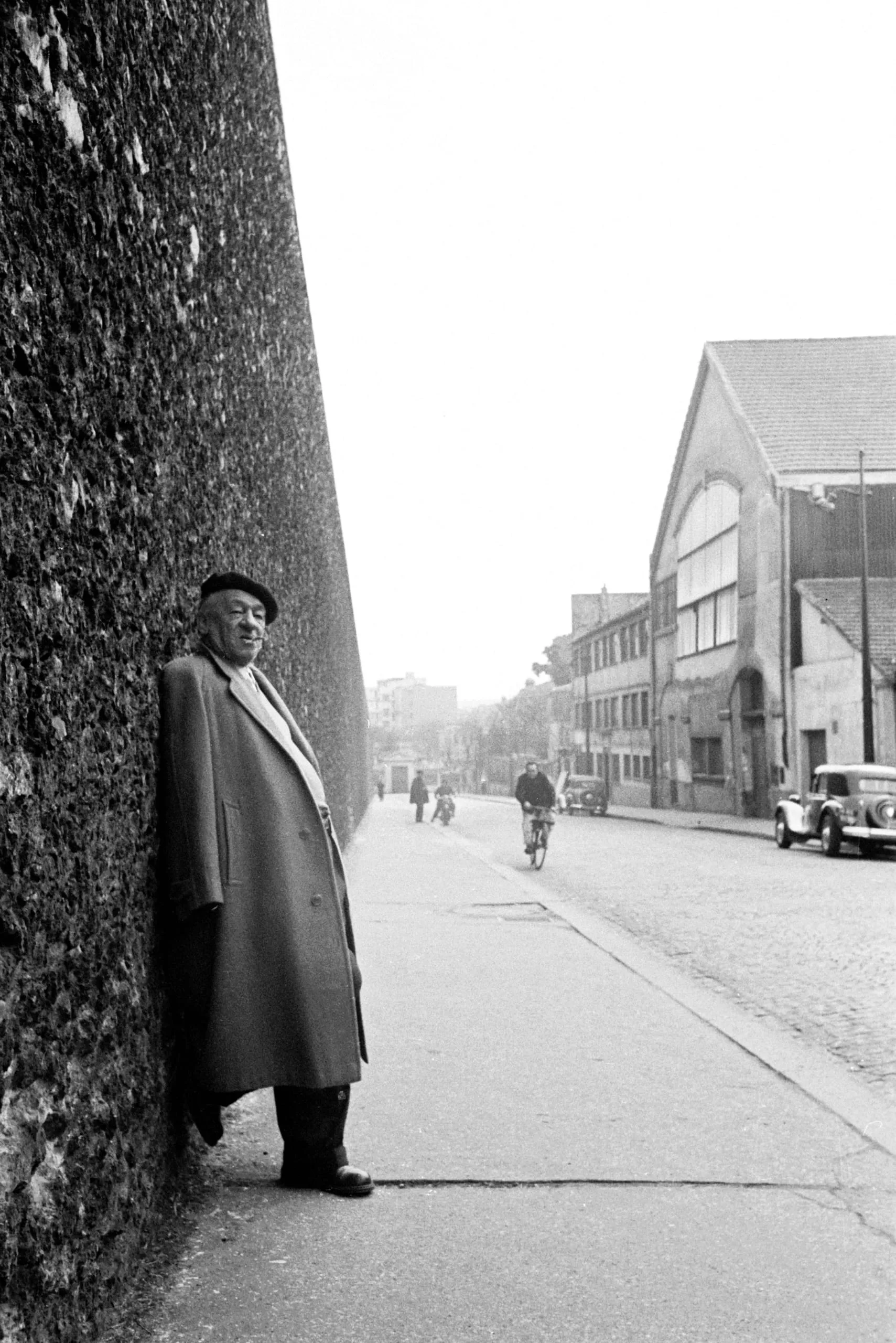 Black and white photograph of a heavyset man in a long overcoat and beret leaning against a massive rough stone wall, with a European street and cyclist visible in the distance