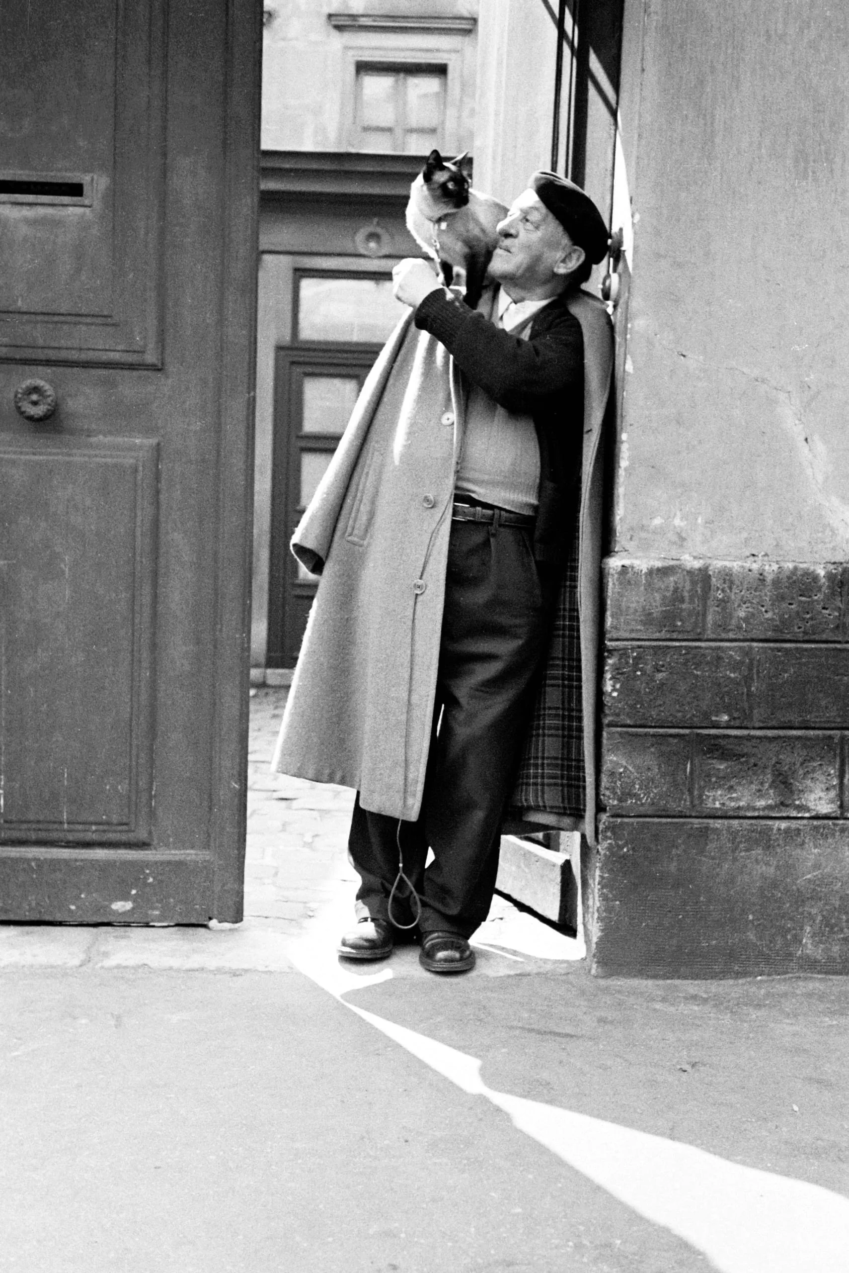 Black and white photograph of an older man in a beret and dark clothes, holding a Siamese cat up to his face against a stone wall